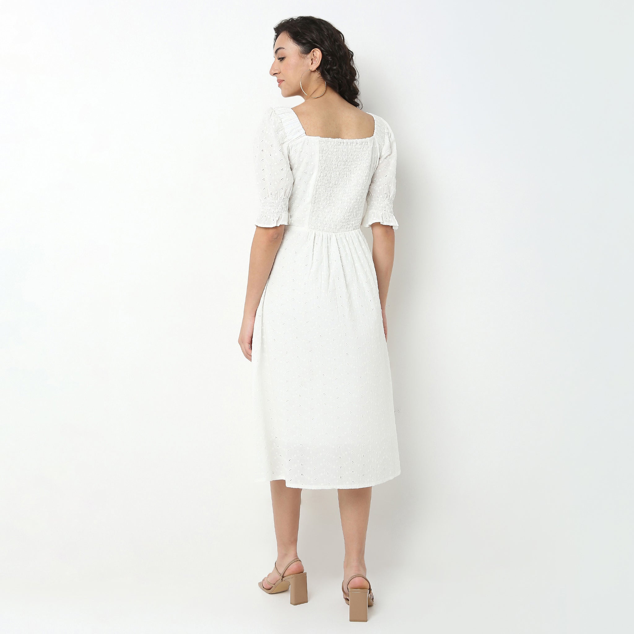 Experience the perfect blend of elegance and comfort with our Cotton Schiffi Dress. Crafted from 100% cotton, this dress offers a breathable and soft touch against your skin, making it ideal for warm days. The intricate Schiffi pattern adds a touch of sophistication, while the sweetheart neck enhances your feminine charm. With a flare fit, this dress provides a flattering silhouette that moves gracefully with you.