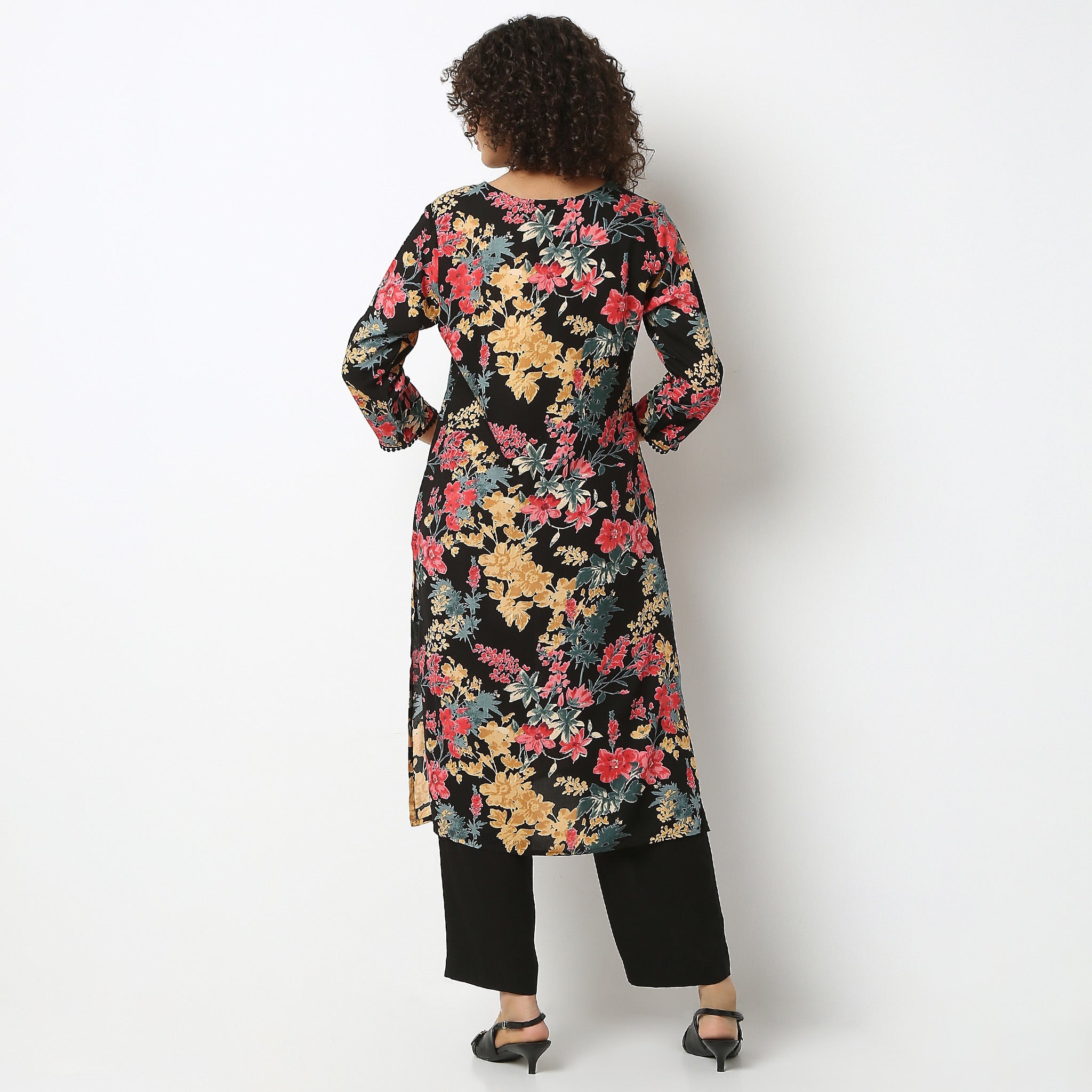 Round Neck Knee Length Three-Fourth Sleeve Straight Fit Printed Kurta