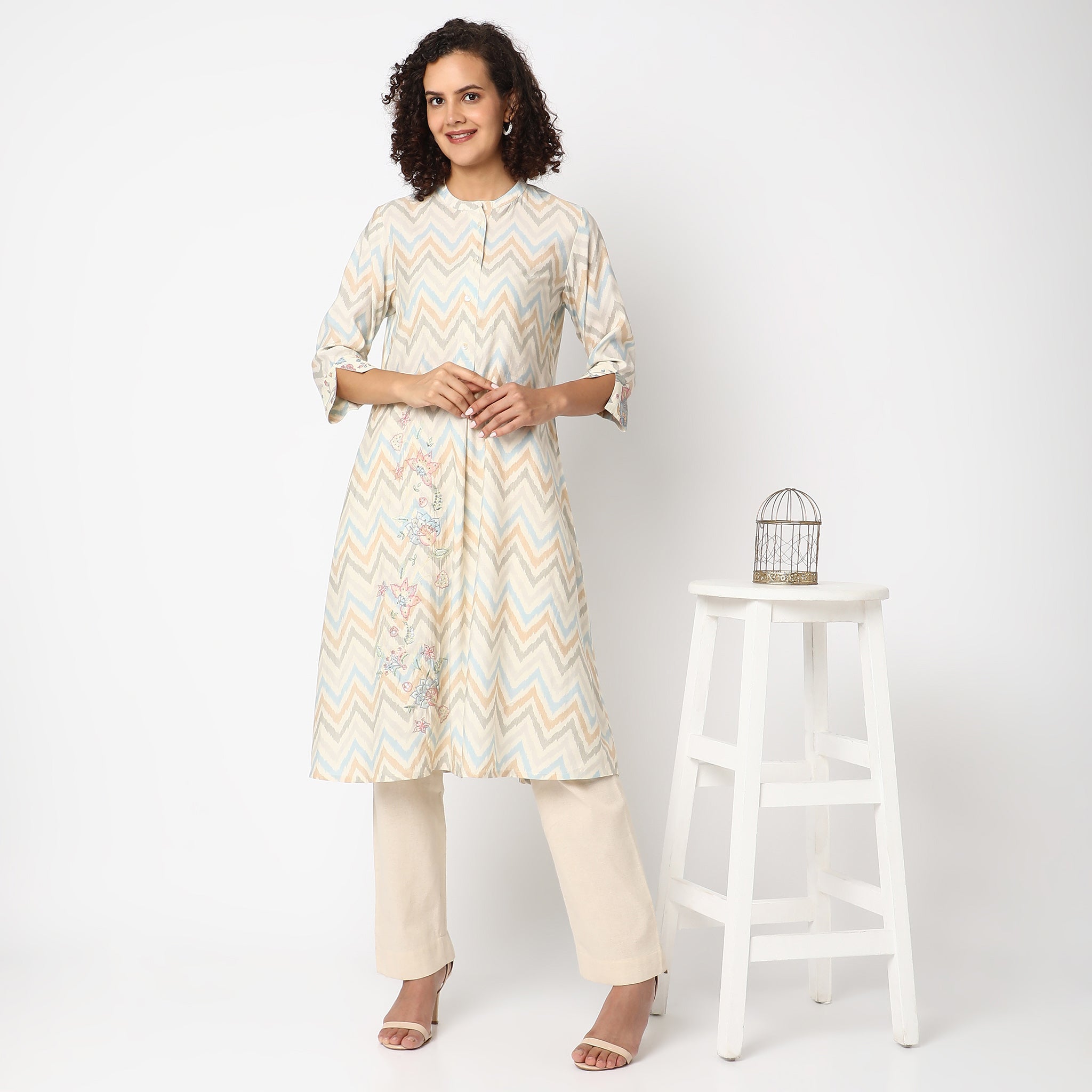 This modern chintz theme printed pattern kurta has a band collar and three-fourth sleeve. Made from viscose muslin, it is soft and comfortable to wear.
