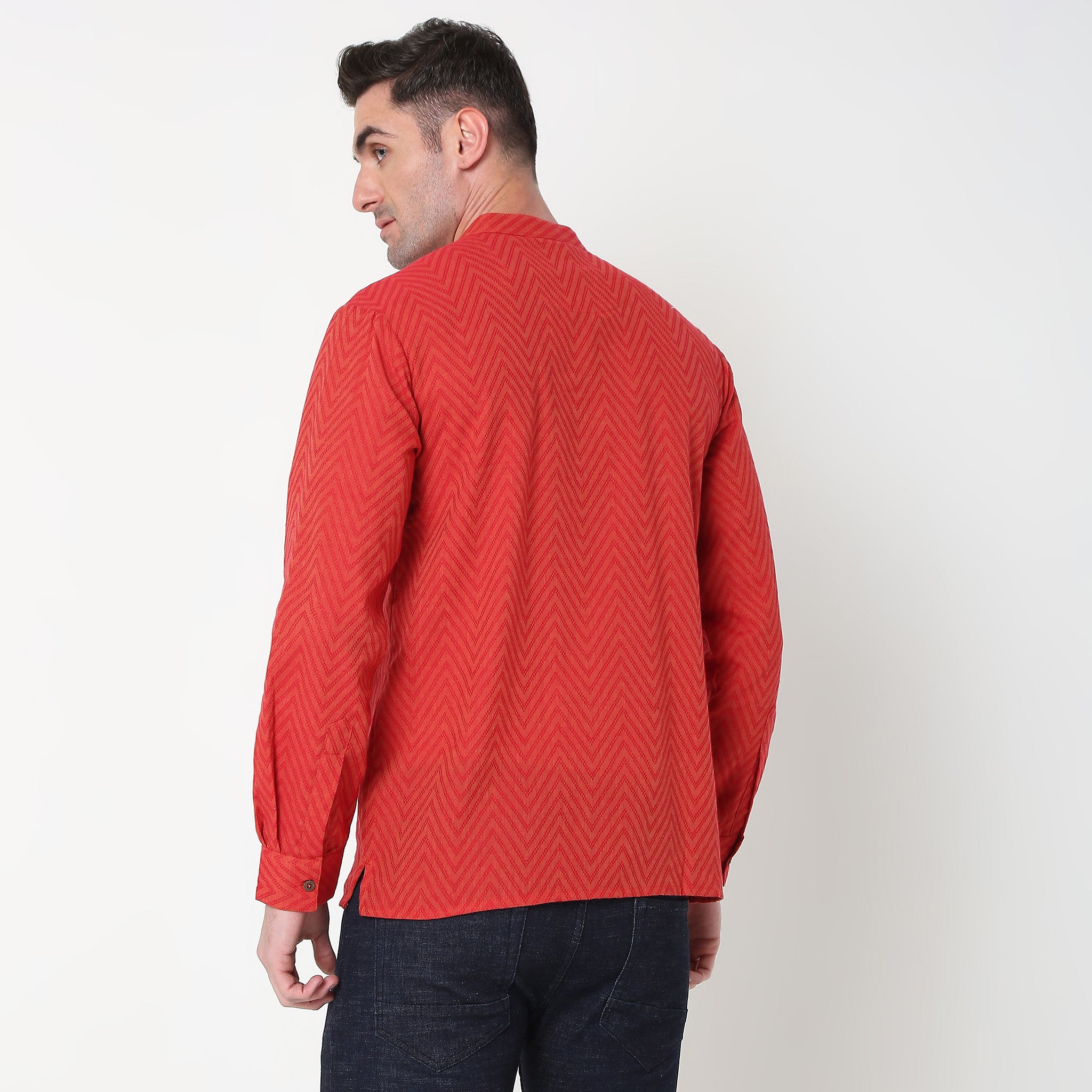 This jacquard pattern short kurta has a mandarin collar and full sleeve. Made from cotton, it is soft and comfortable to wear.