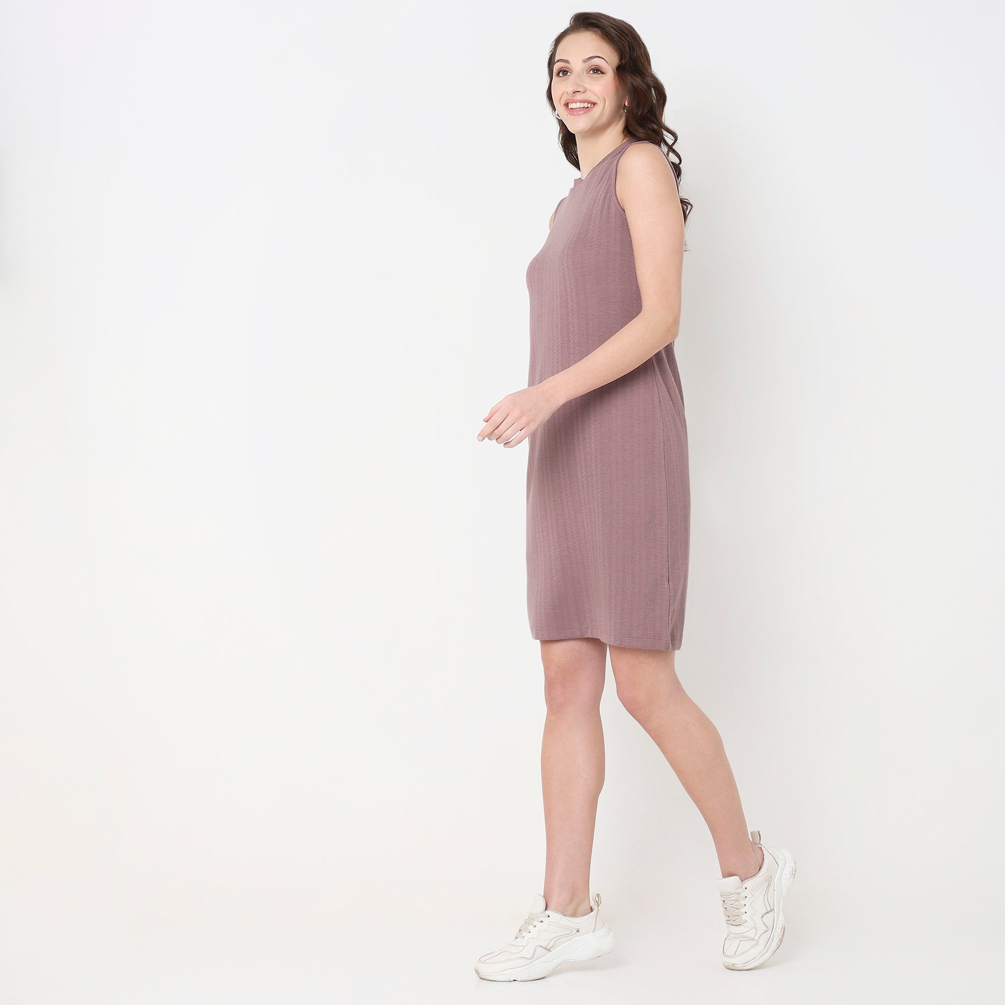 This structured pattern dress has a round neck and sleeveless. Made from polyester viscose elastane, it is soft and comfortable to wear.