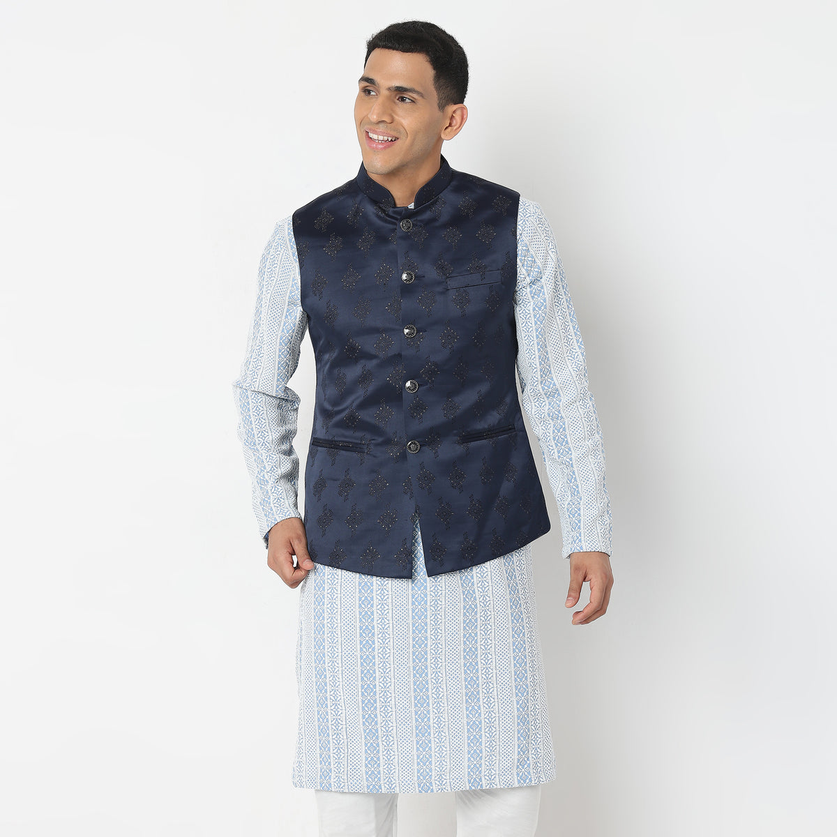 These regular fit ethnic jacket has mandarin collar, short length. Made from polyester it is soft and comfortable to wear.