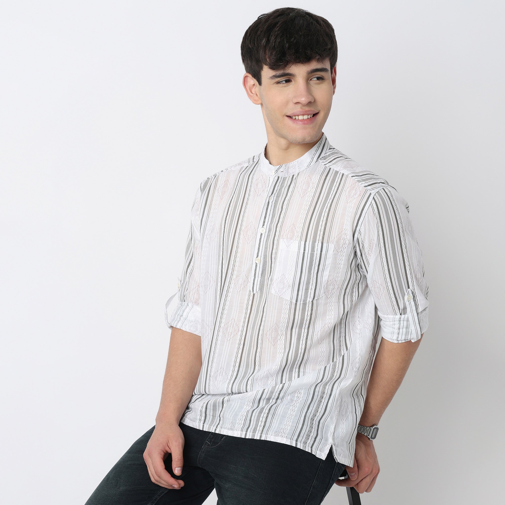 Experience the perfect blend of comfort and style with our Striped Cotton Kurta. Crafted from 100% cotton, this kurta offers a breathable and soft touch against your skin, making it ideal for all-day wear. The woven fabric ensures durability while maintaining a lightweight feel, perfect for any season. The mandarin collar adds a touch of sophistication, making it suitable for both casual outings and semi-formal events.