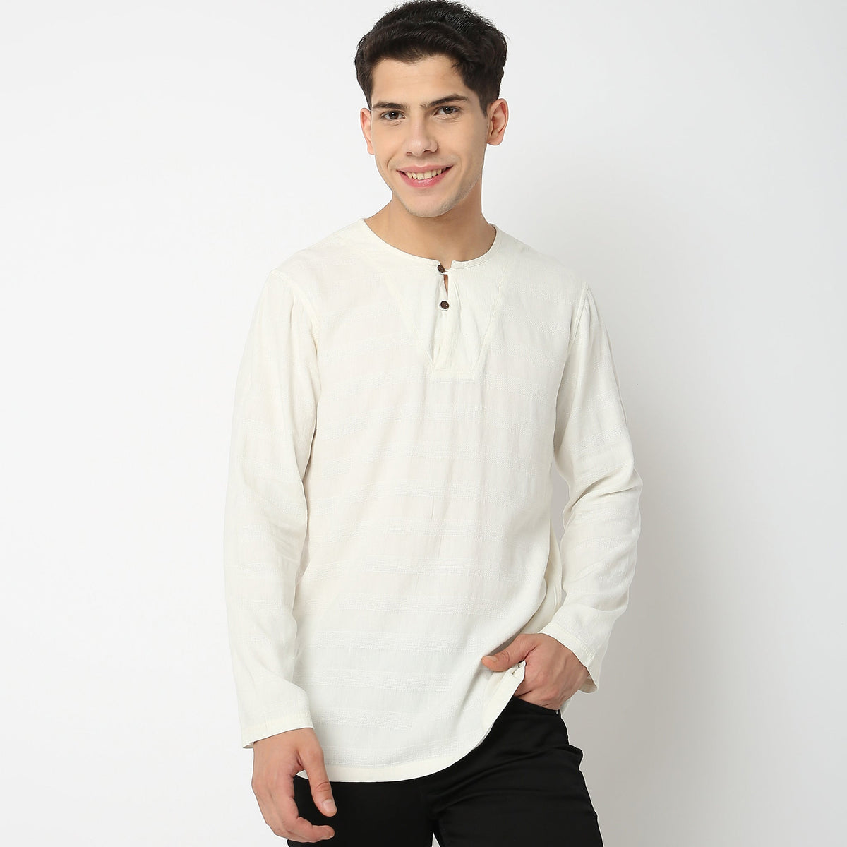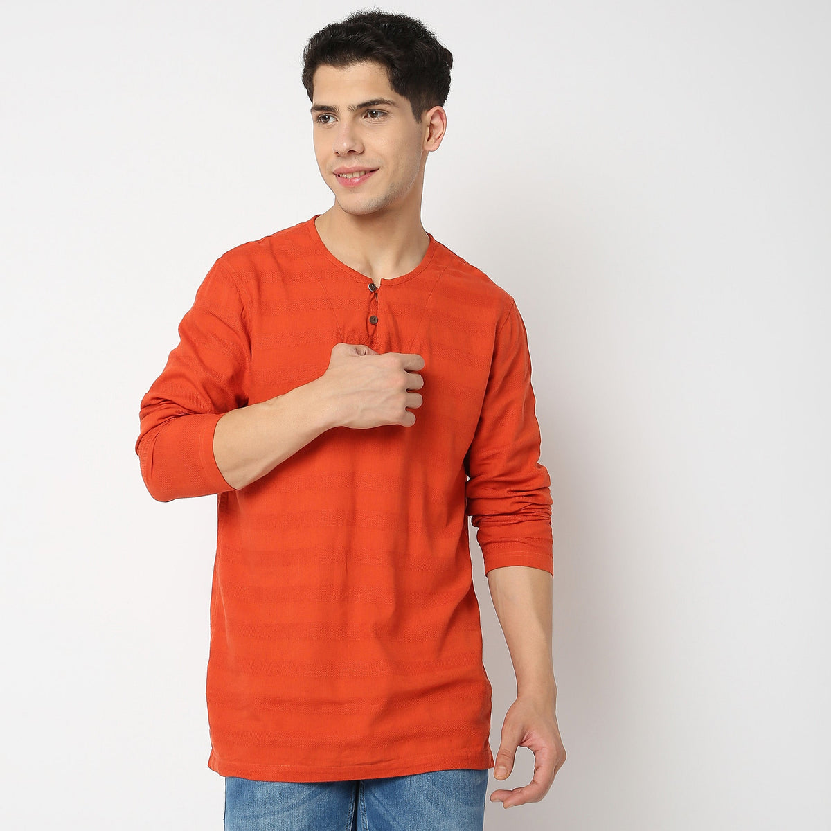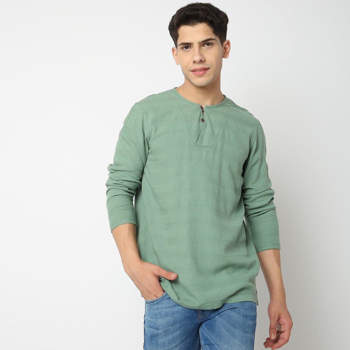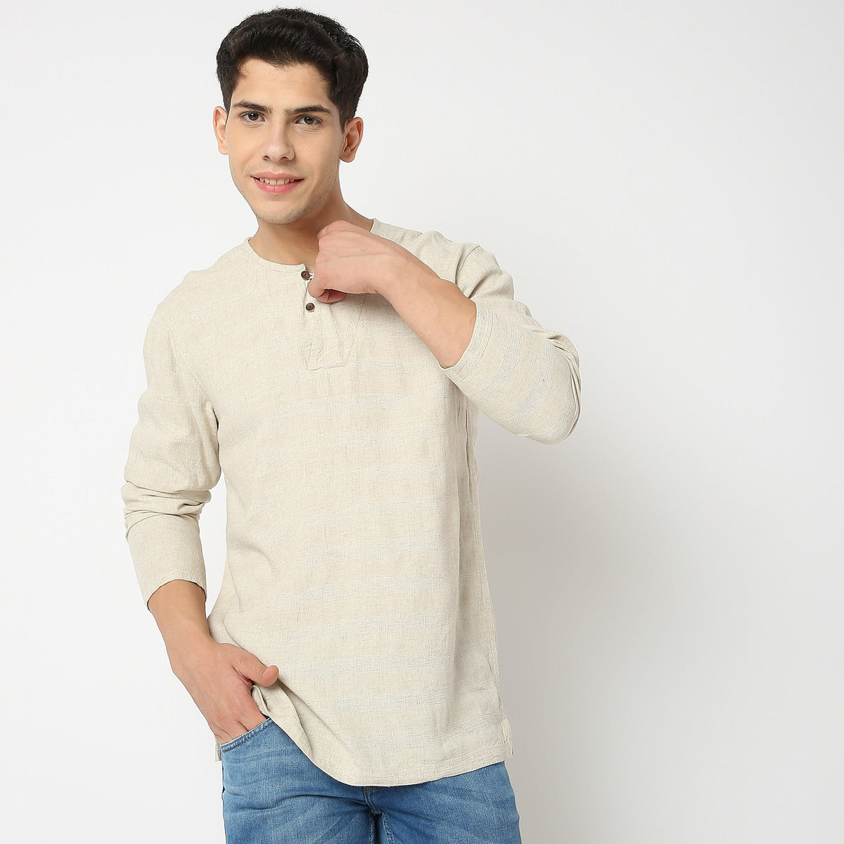 Modern Explorer - Henley Neck - Linen Blend Horizontal Self Weave Pattern - Full Sleeve Shirt