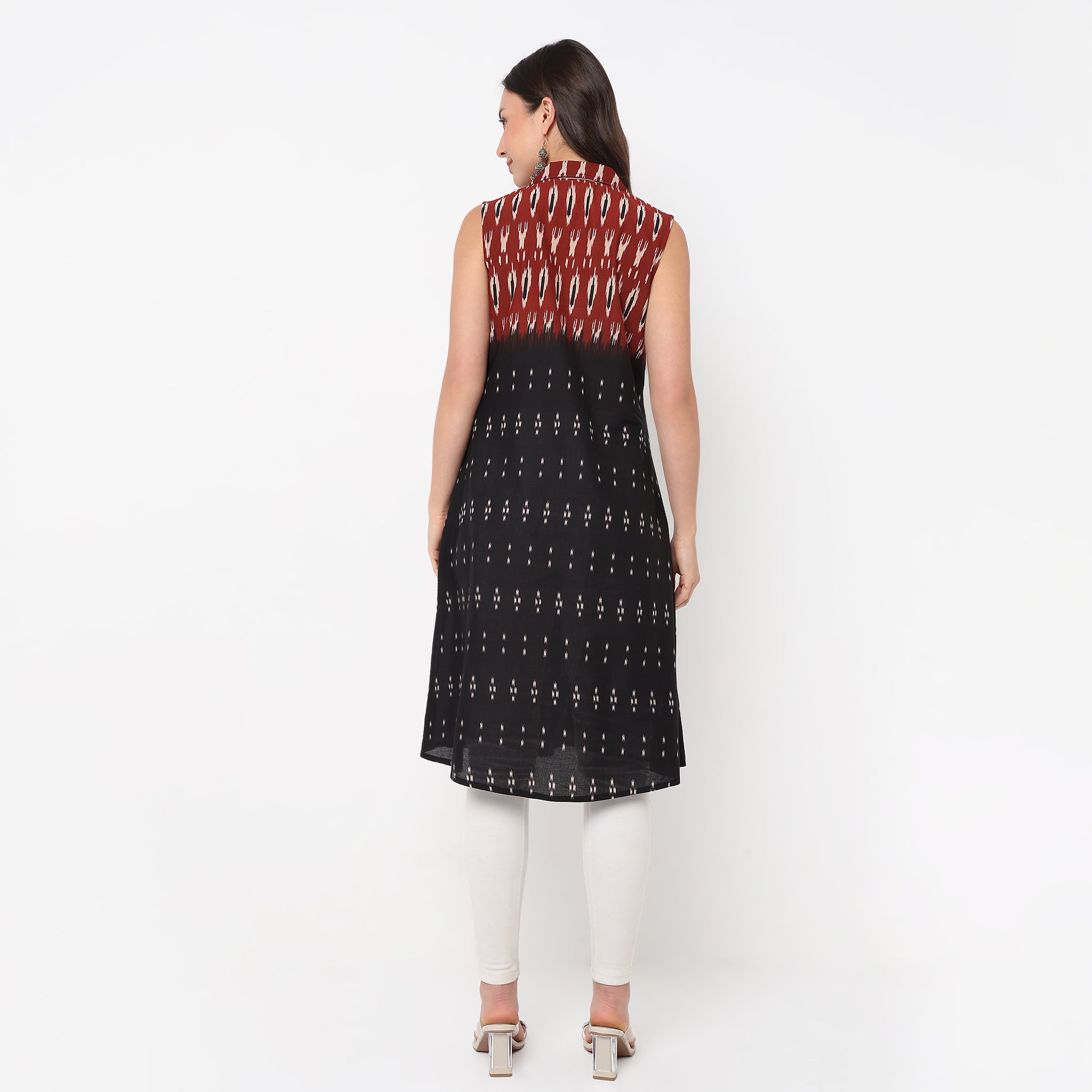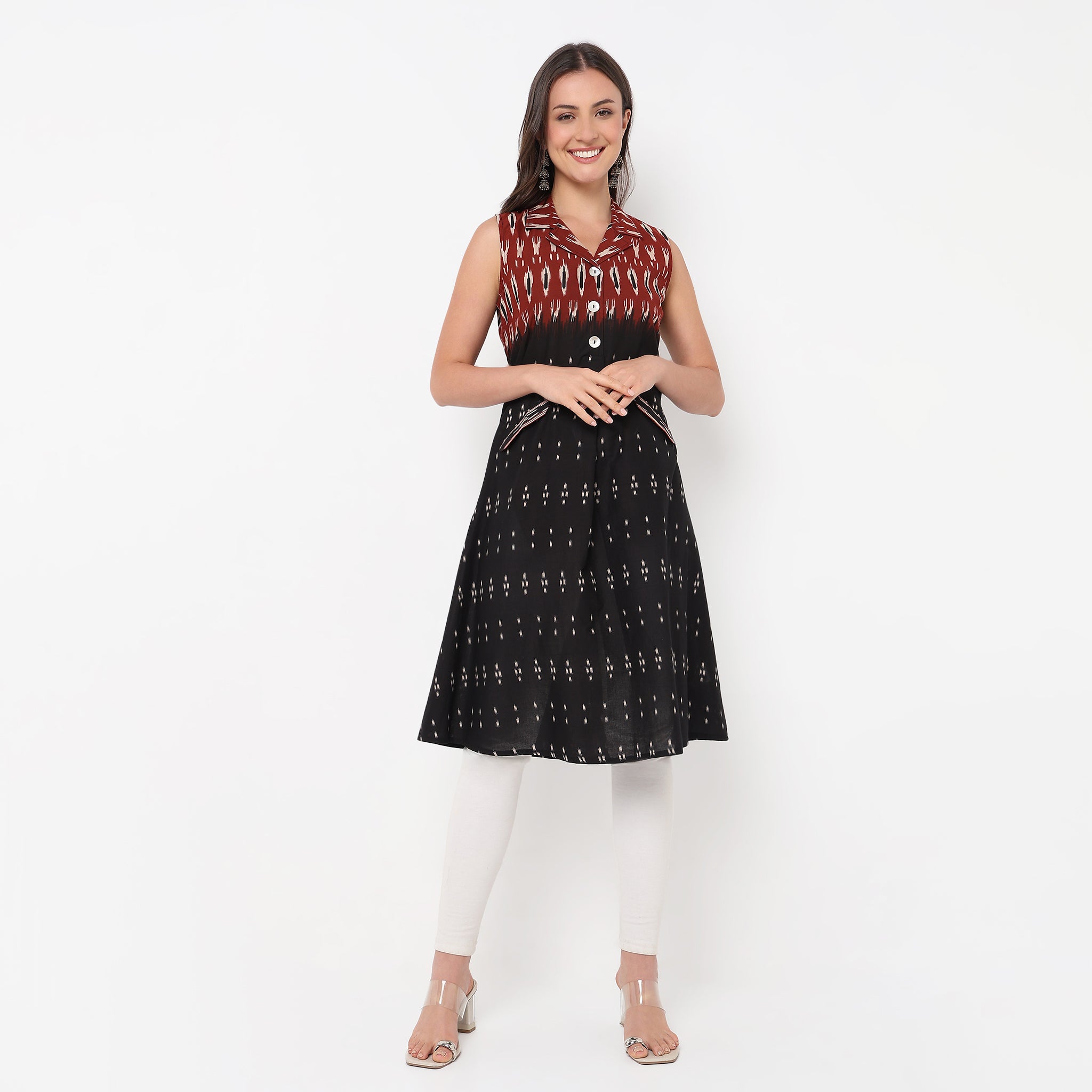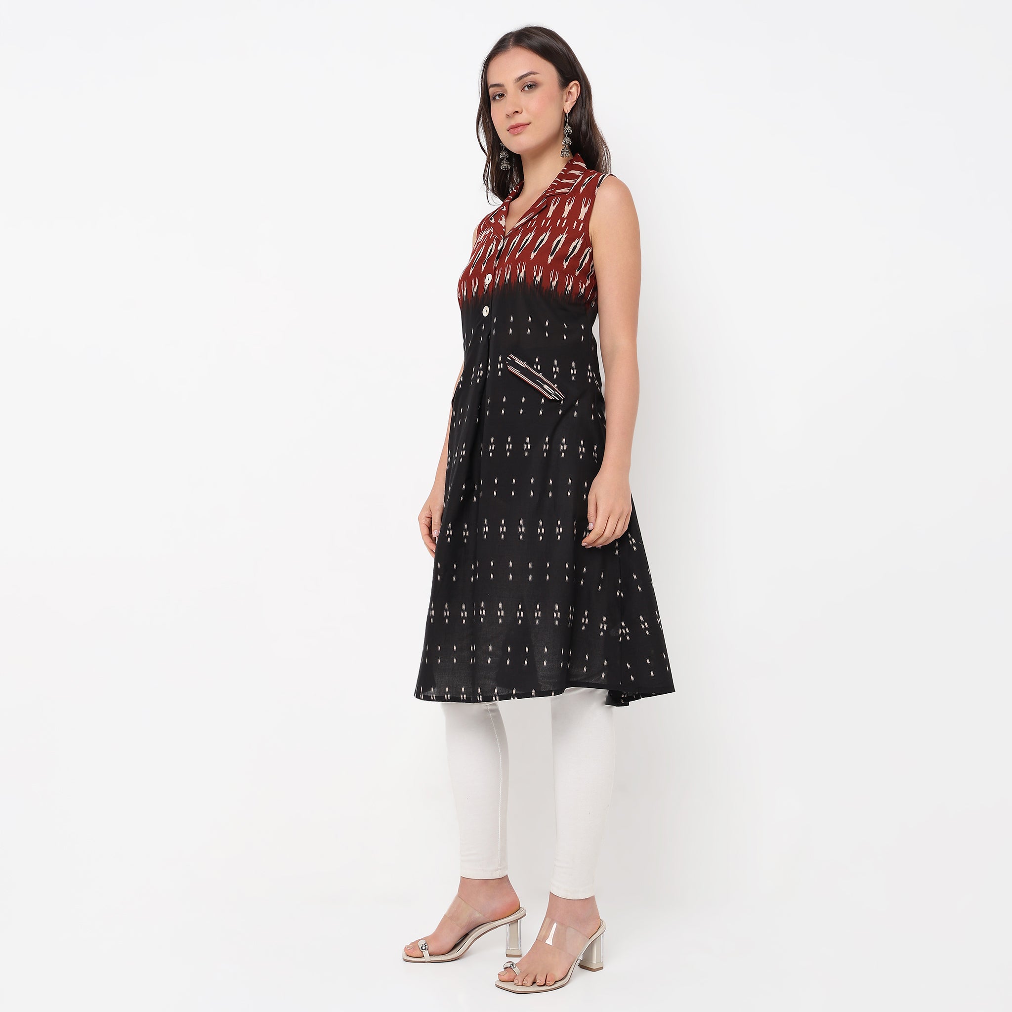 Experience the perfect blend of style and comfort with our Flare Fit Printed Lapel Collar Sleeveless Kurta. Crafted from 100% cotton, this kurta offers a breathable and soft touch against your skin, making it ideal for all-day wear. The vibrant printed pattern adds a touch of elegance, while the flared cut provides a graceful silhouette that flatters every body type. Whether you're heading to a casual brunch or a festive gathering, this kurta is your go-to choice for effortless style.