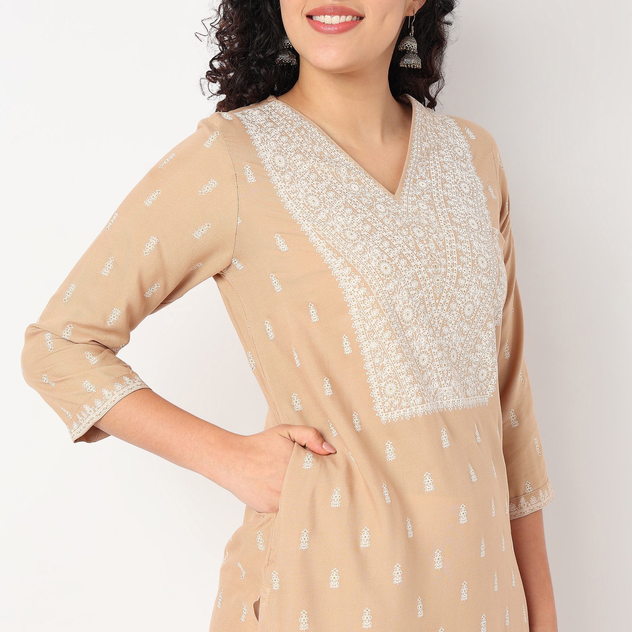 Experience the perfect blend of comfort and style with our Printed V-Neck Kurta. Crafted from 100% Rayon, this kurta offers a soft, breathable feel that keeps you comfortable all day long. The woven fabric ensures durability and a premium look, while the vibrant printed pattern adds a touch of elegance to your wardrobe. With its calf-length design and straight fit, this kurta is versatile enough for both casual outings and formal gatherings. The three-fourth sleeves provide a chic look, making it ideal for any season.