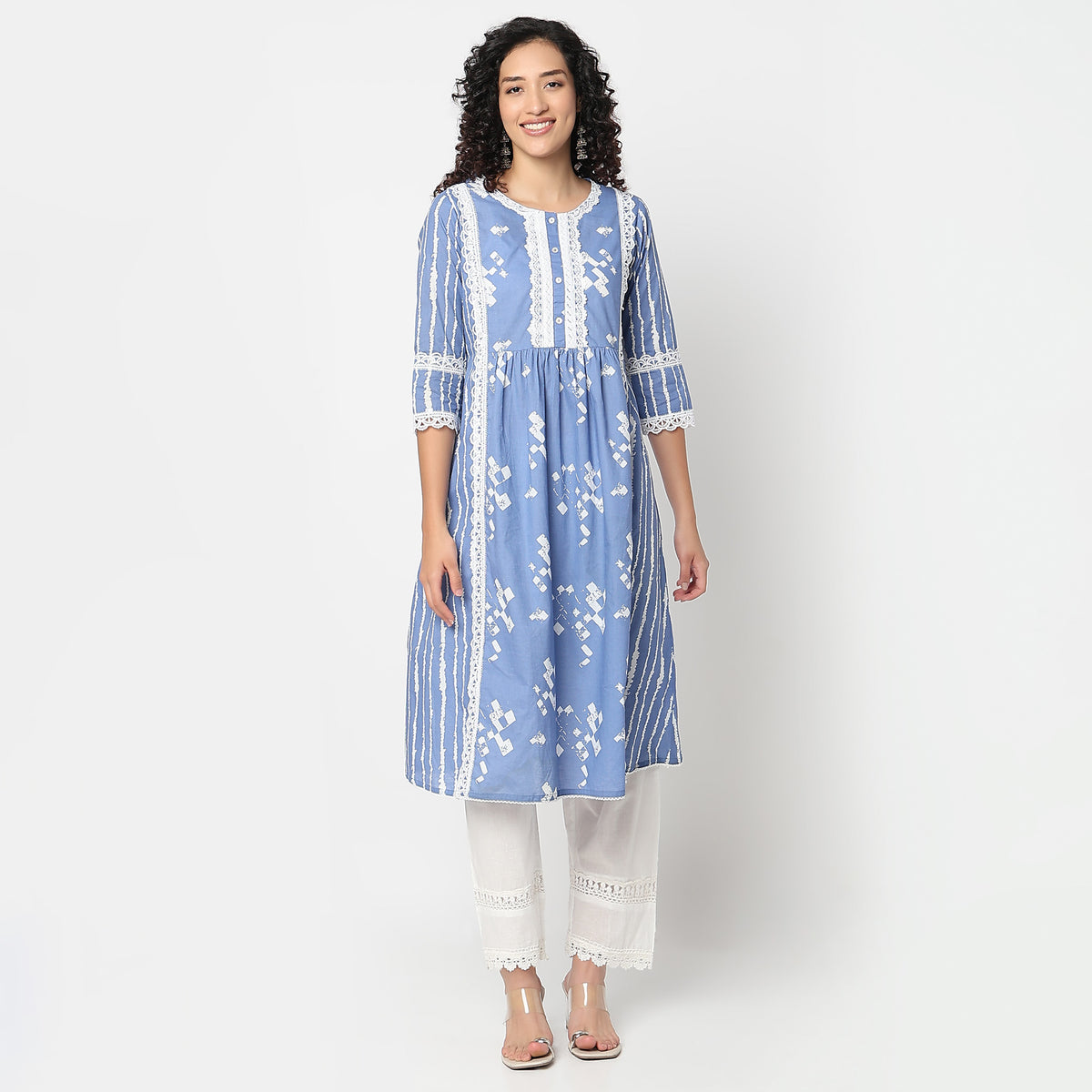Experience the perfect blend of comfort and style with our Abstract Printed Kurta with Lace Highlight. Crafted from 100% cotton, this kurta is designed to keep you cool and comfortable all day long. The flare fit offers a graceful silhouette that flatters every body type, while the gathered cut shape adds a touch of elegance. Whether you're heading to a casual outing or a festive gathering, this kurta is your go-to choice for effortless style.