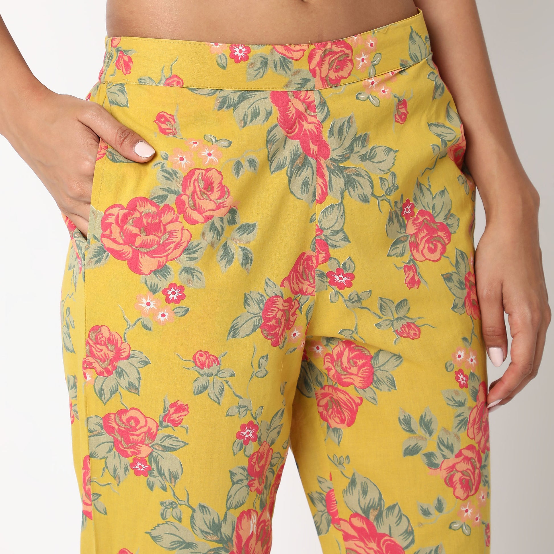 This fusion set theme printed pattern kurta sets has a lapel collar and three-fourth sleeve. Made from cotton, it is soft and comfortable to wear.