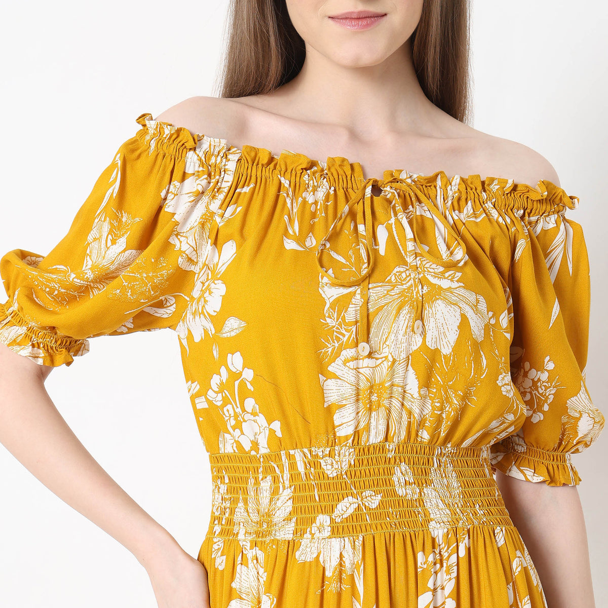 This printed pattern dress has a offshoulder and short sleeve. Made from viscose, it is soft and comfortable to wear.