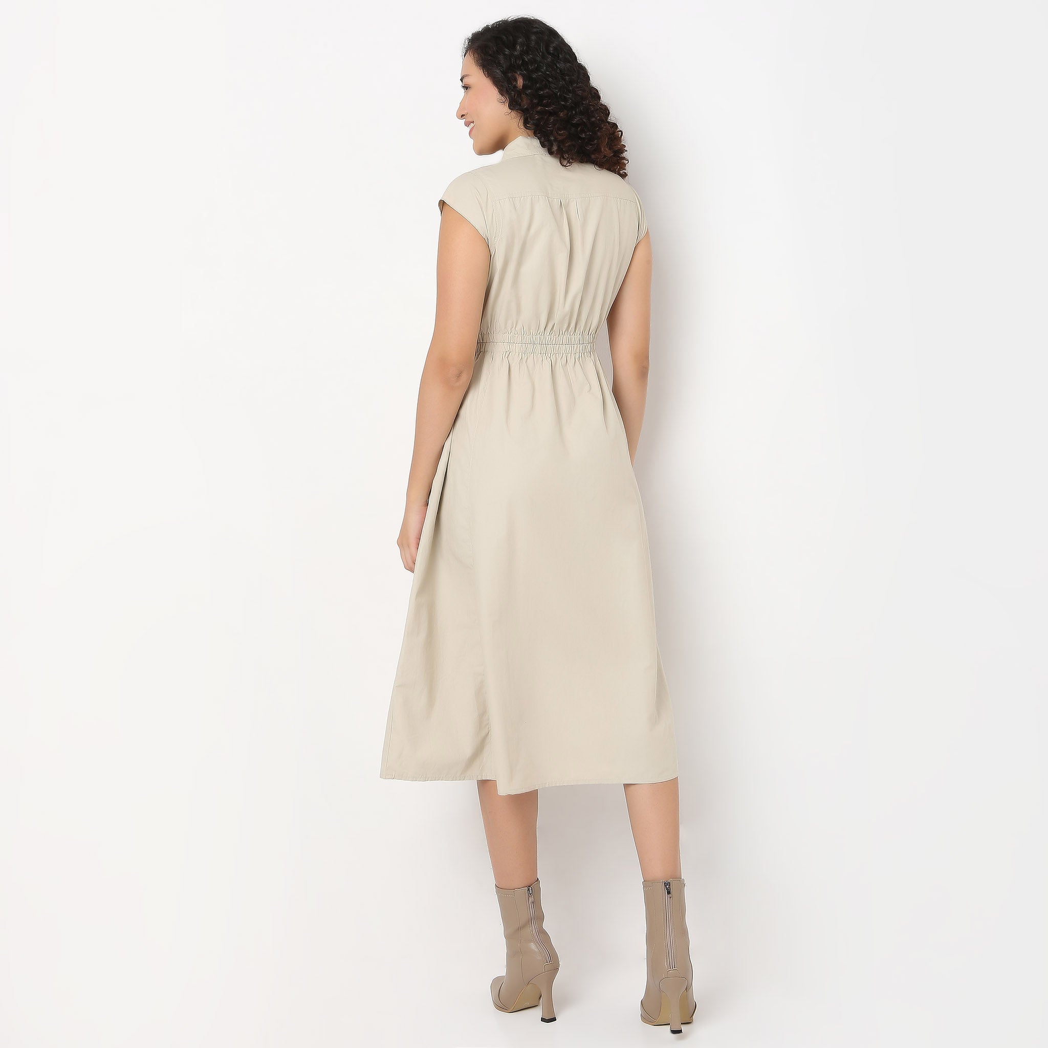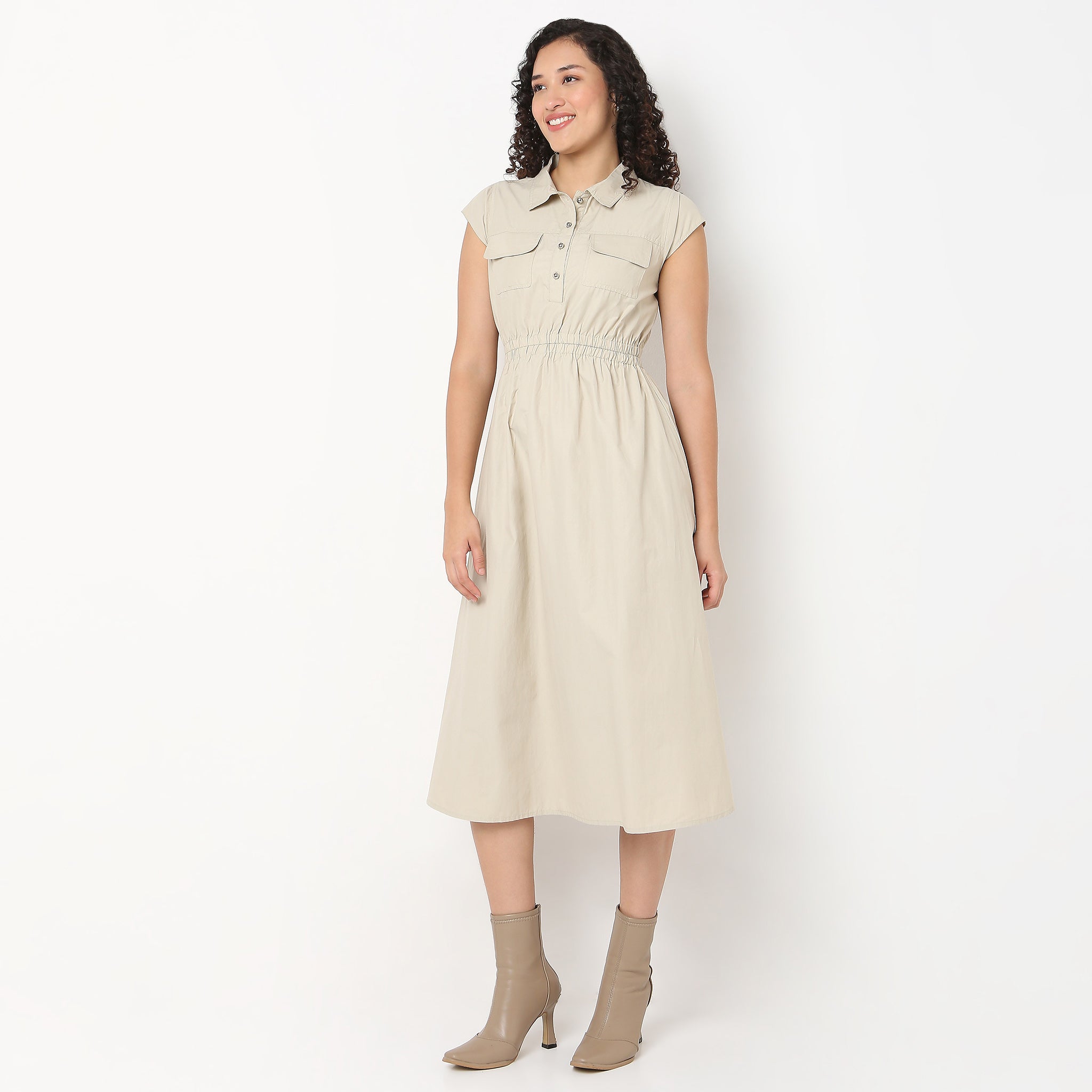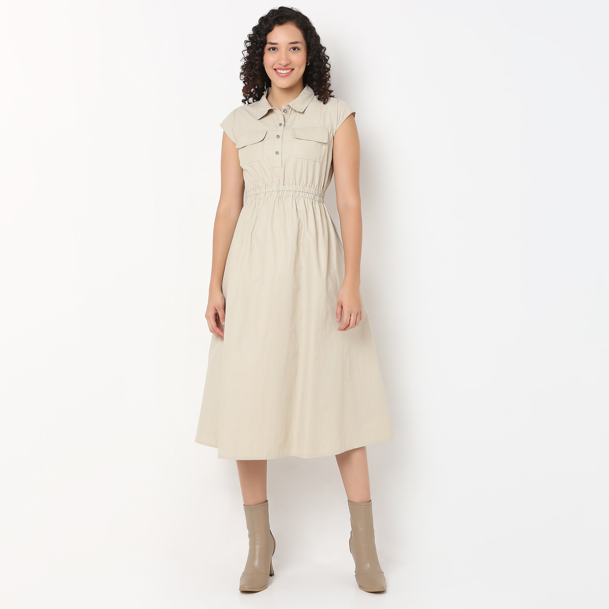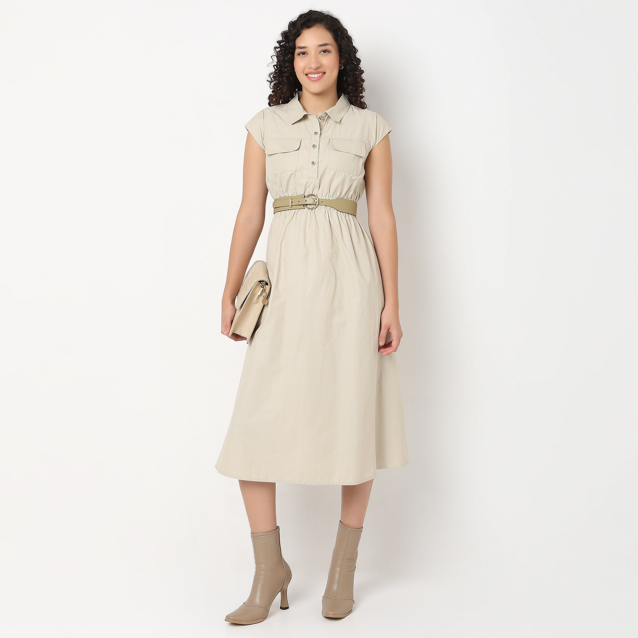 Step into elegance with our Flared Collar Dress, a perfect blend of comfort and style. This dress is crafted from a soft polyester-cotton blend, ensuring a breathable and lightweight feel that keeps you comfortable all day long. The solid pattern and knee-length design make it versatile for both casual outings and formal events. The shirt collar adds a touch of sophistication, while the cap sleeves offer a modern twist. With a flare fit, this dress provides a flattering silhouette that enhances your natural curves.