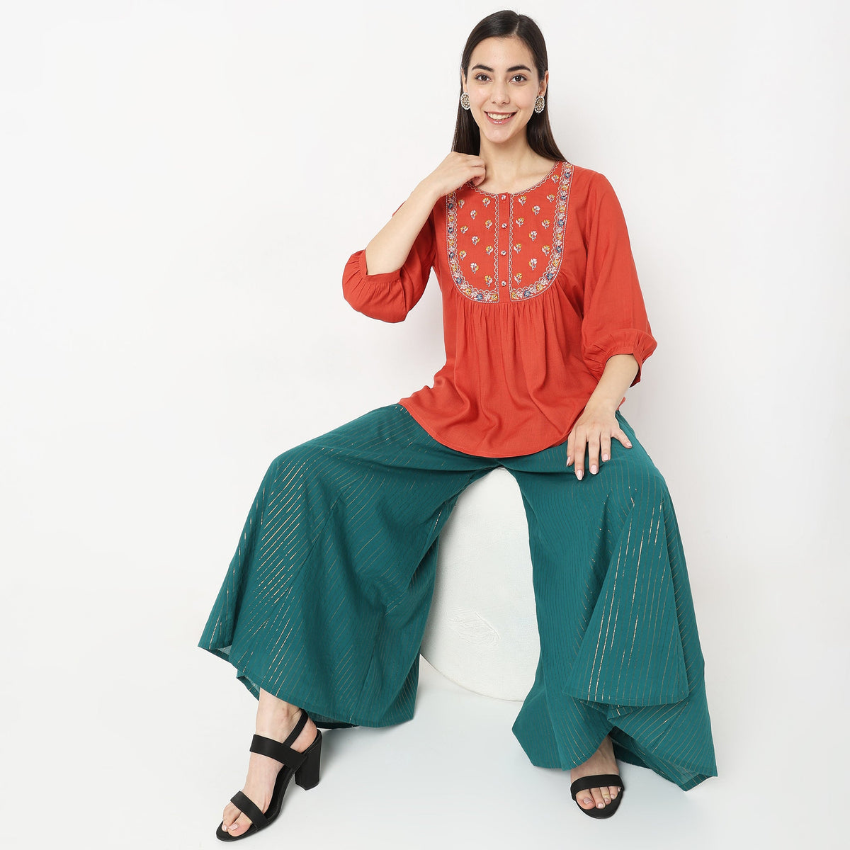 These mid flare top has above knee length. Made from rayon, it is soft and comfortable to wear.