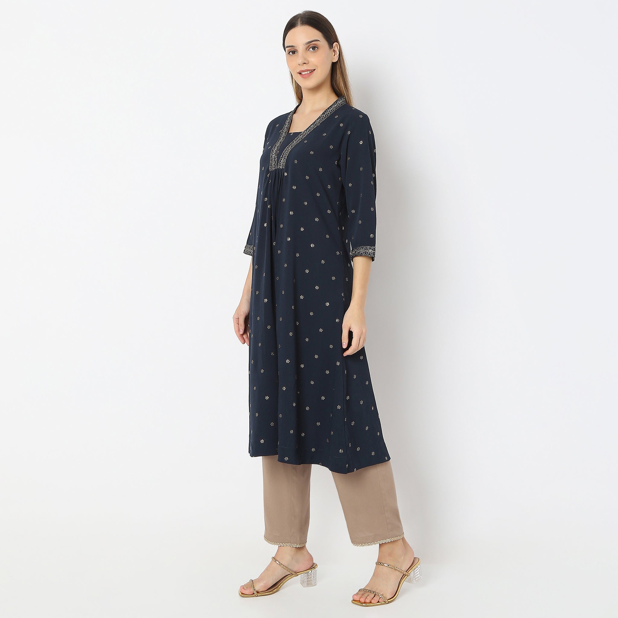 Experience the elegance and comfort of our Printed Below Knee V-Neck Embroidered Majesty Flared Kurta. Crafted from high-quality polyester, this kurta offers a luxurious feel and a flattering silhouette that enhances your natural grace. Perfect for any occasion, its versatile design ensures you look effortlessly stylish whether you're attending a casual gathering or a festive celebration.
