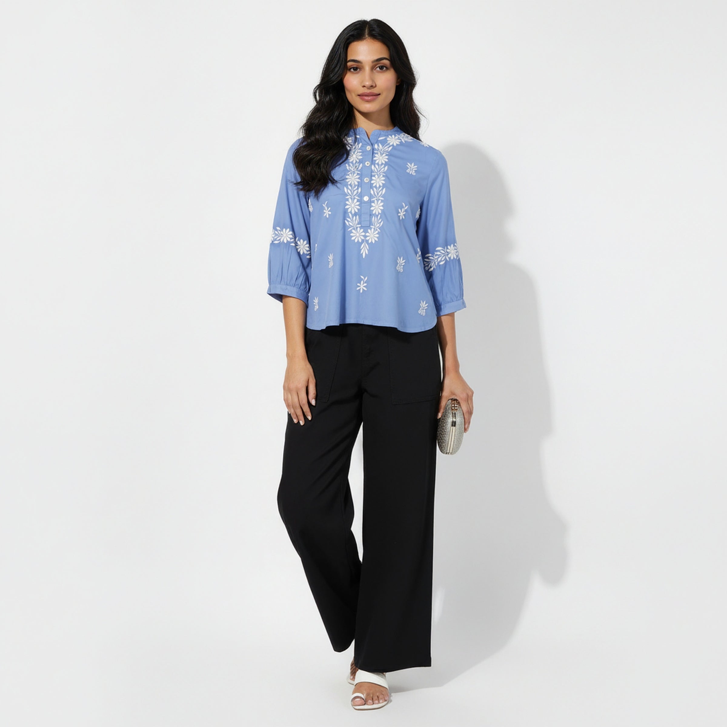 Experience the perfect blend of comfort and style with our Embroidered Band Neck Rayon Top. Crafted from 100% rayon, this top offers a soft, breathable feel that keeps you comfortable all day long. The elegant embroidered pattern adds a touch of sophistication, making it a versatile piece for any wardrobe.