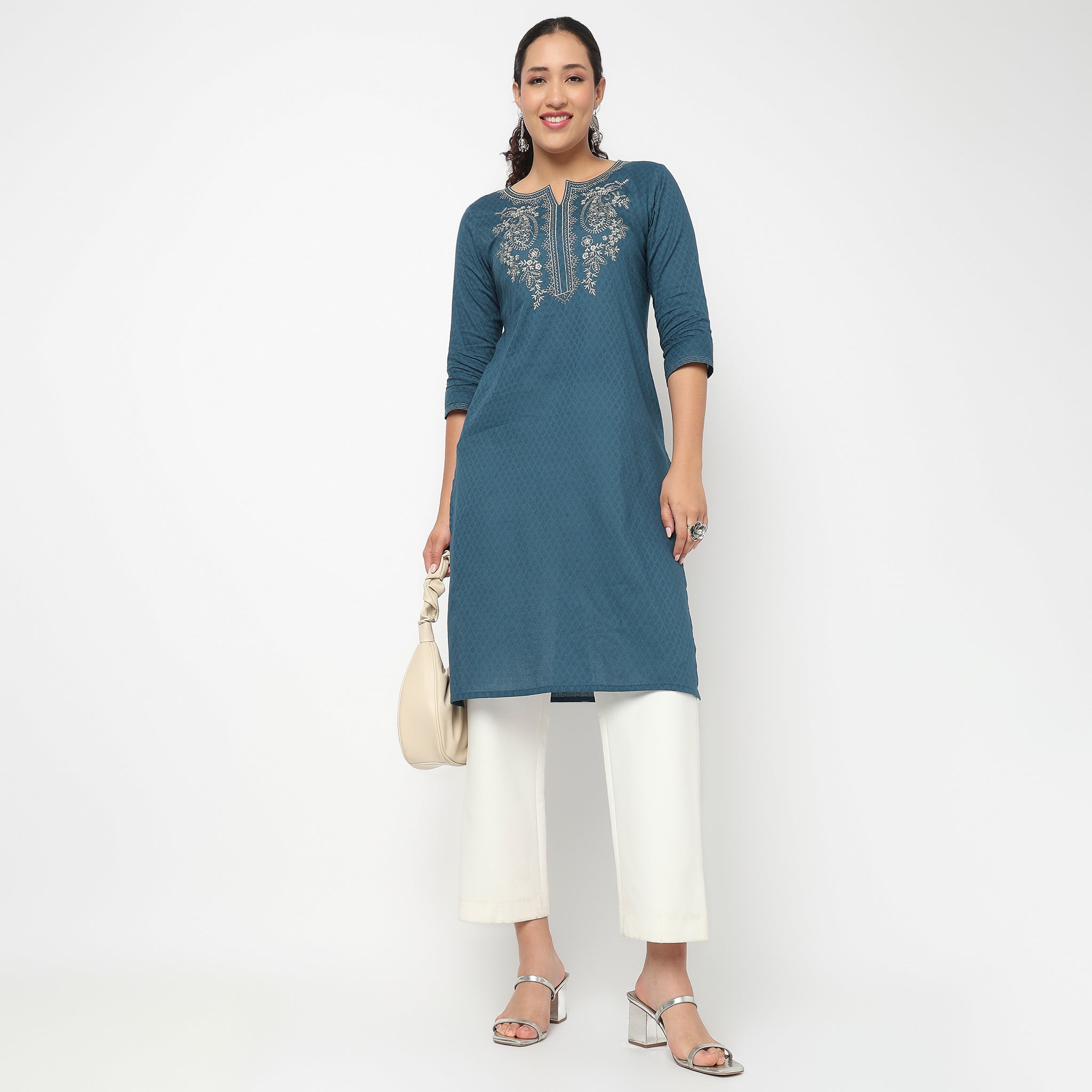 Elevate your wardrobe with the Embroidered Yoke Long Kurta, a perfect blend of comfort and style. Crafted from woven cotton, this knee-length kurta is designed for the modern woman who appreciates intricate detailing.