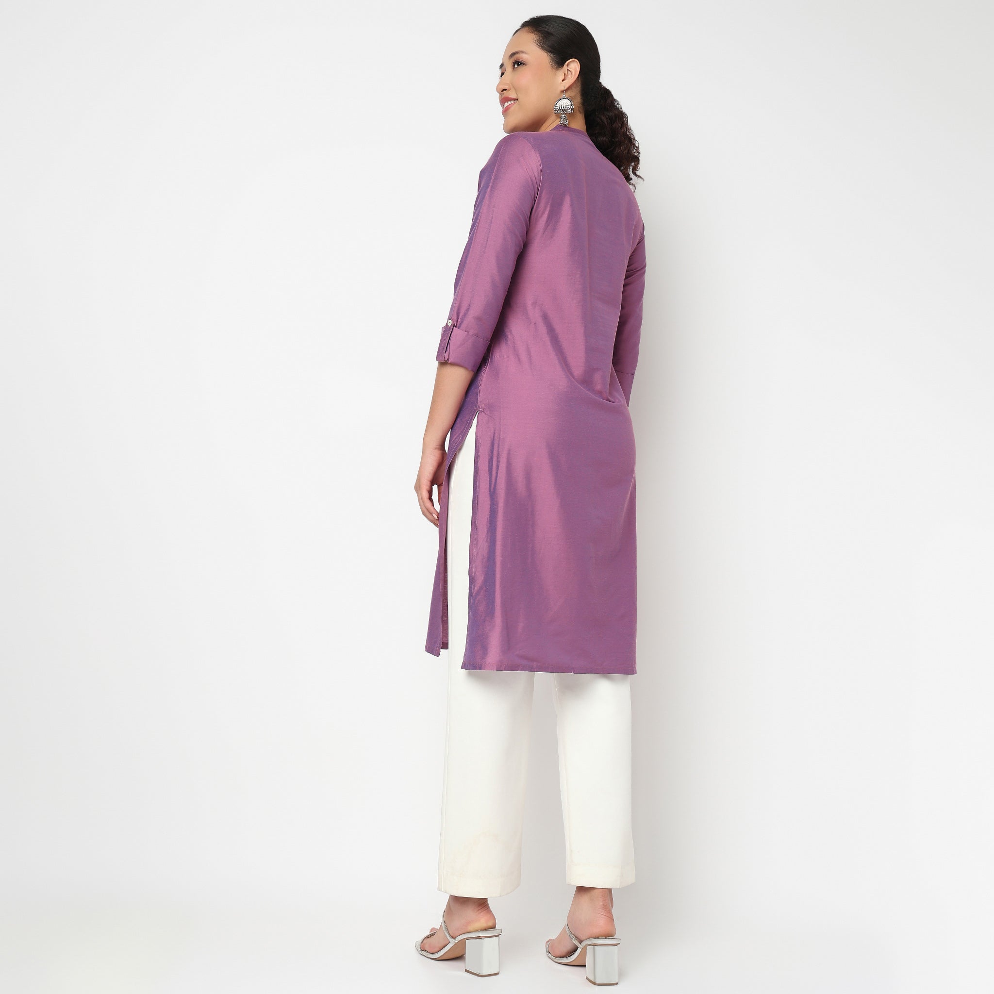 - Includes three-fourth sleeves and a chic band collar, perfect for both casual and formal settings.