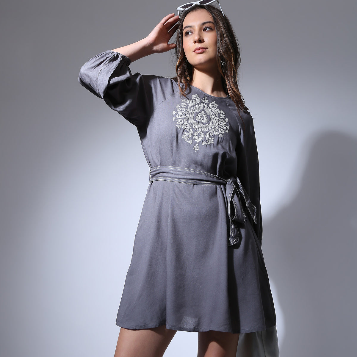 This embroidered pattern Dress has a round neck and three-fourth sleeve. Made from rayon, it is soft and comfortable to wear.