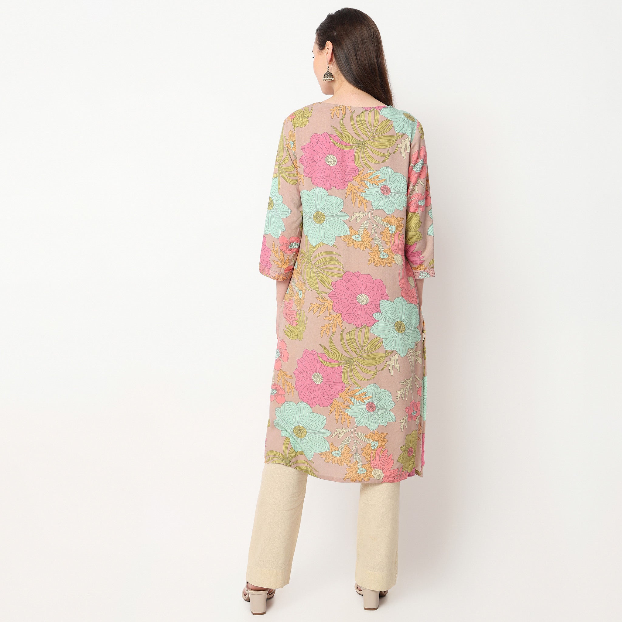 Experience the perfect blend of comfort and style with our Printed Rayon Kurta. Crafted from 100% rayon, this kurta offers a soft, breathable feel that keeps you comfortable all day long. The vibrant printed pattern adds a touch of elegance, making it a versatile choice for both casual outings and festive occasions. The knee-length design and V-neck create a flattering silhouette, while the three-fourth sleeves provide a chic, modern look.