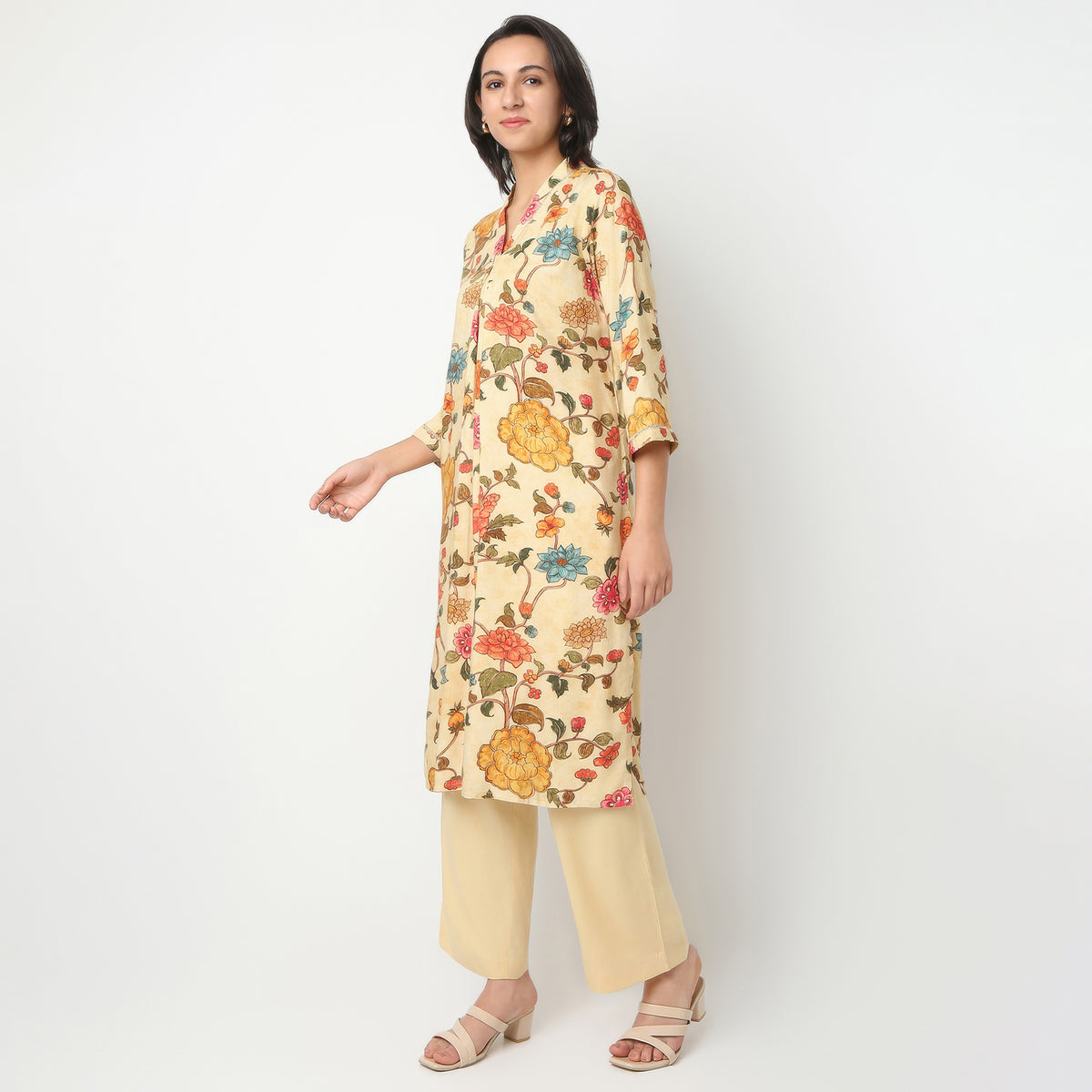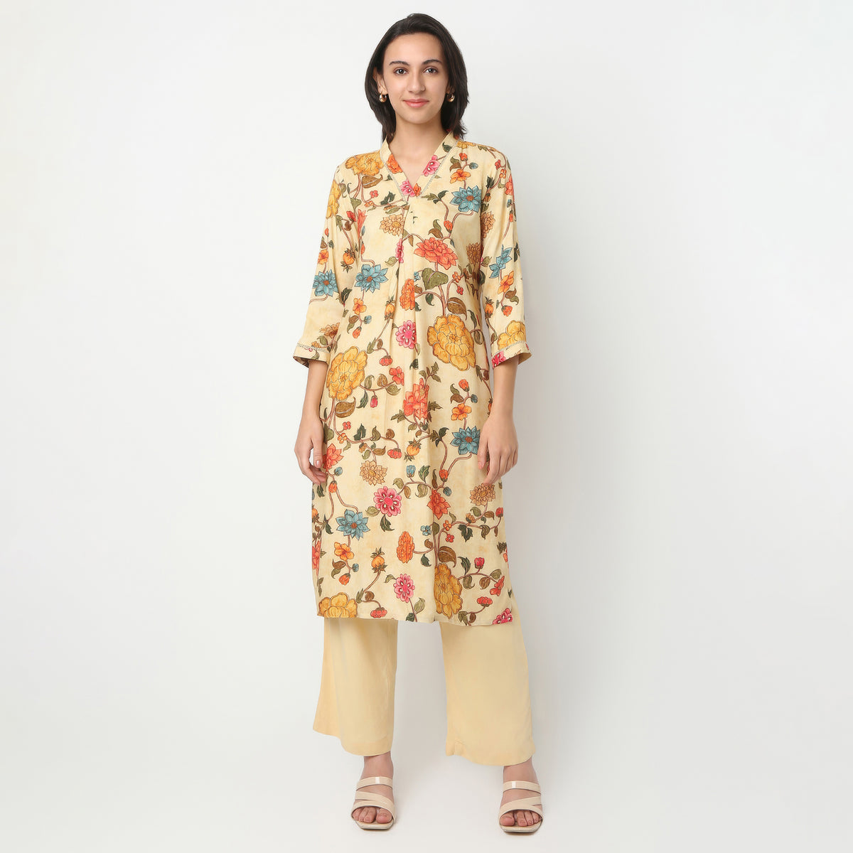 Straight Fit Printed Below Knee V-Neck Kurta With Pant Set