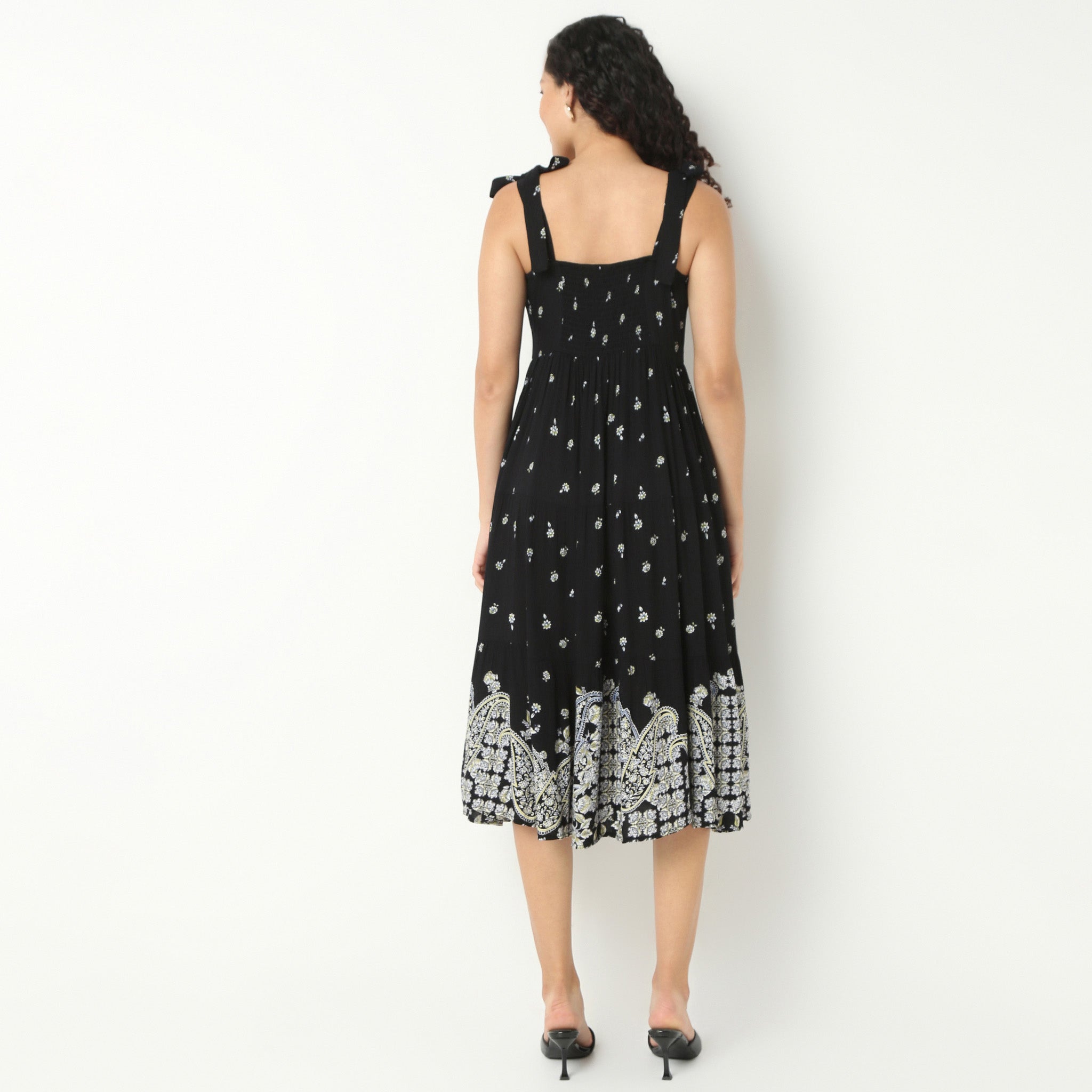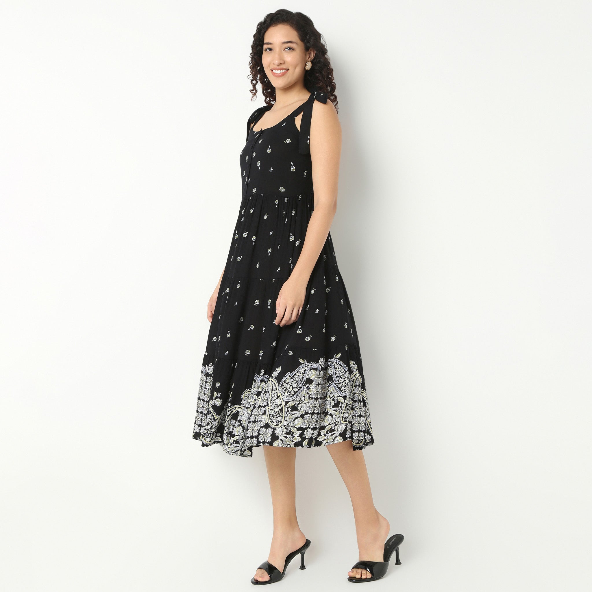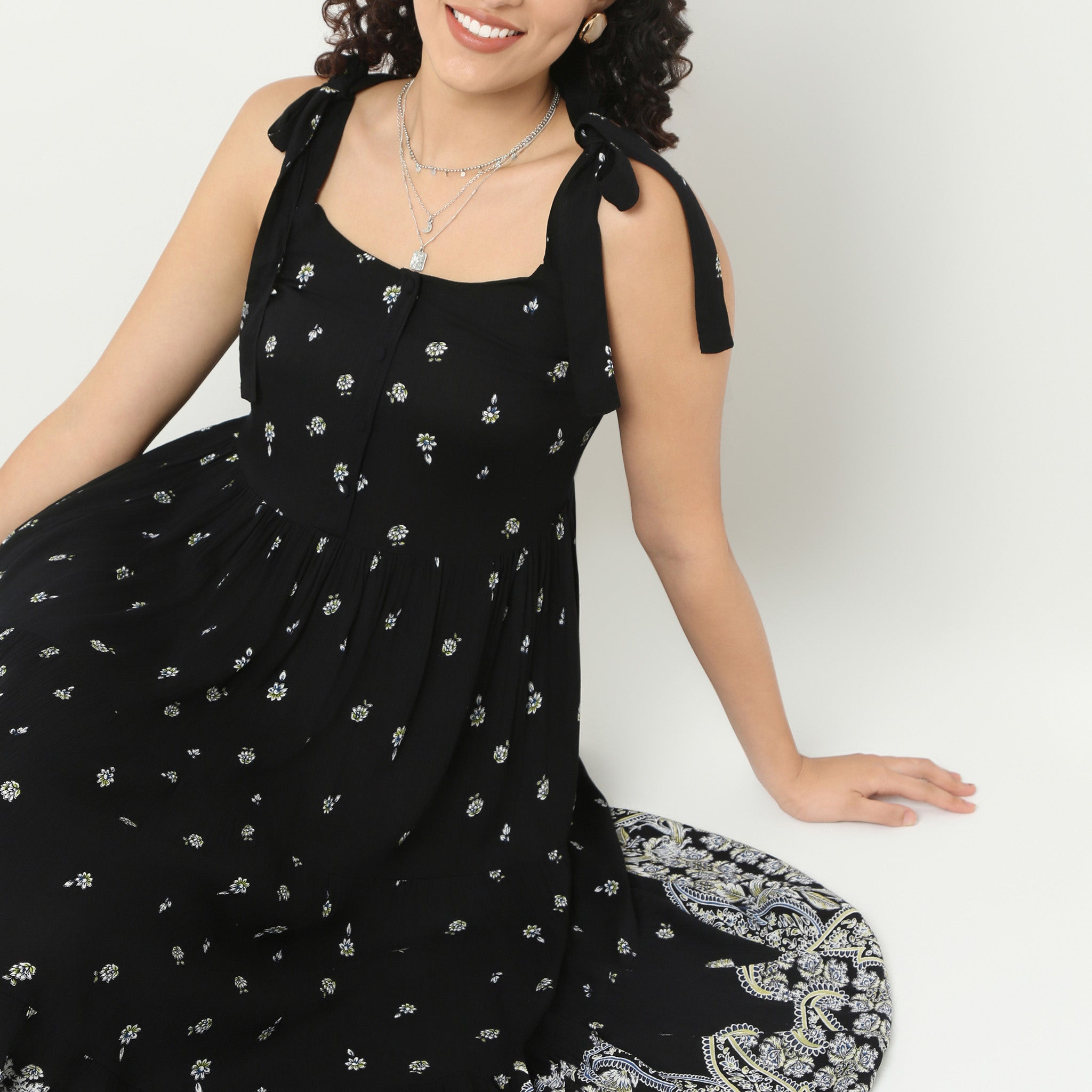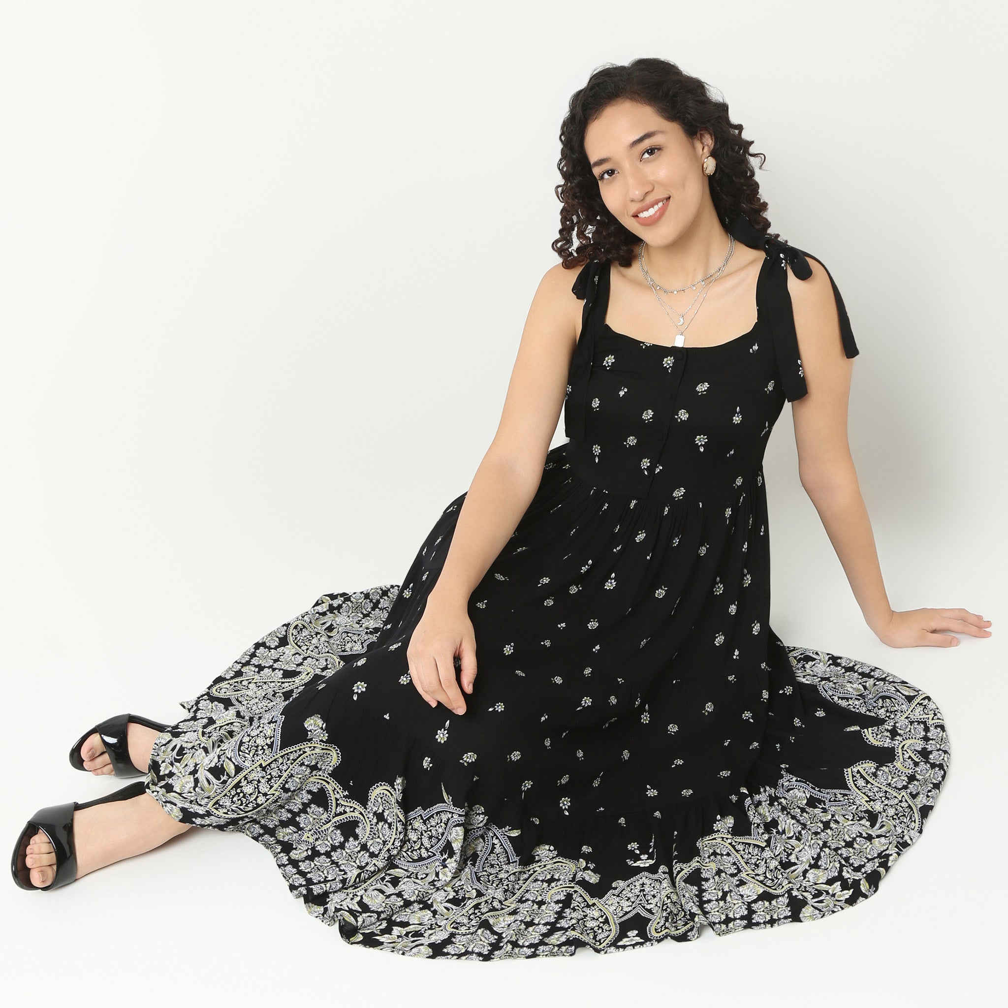 Experience the effortless elegance of our Strappy Tiered Dress, designed to offer both comfort and style. Crafted from luxurious viscose crepe, this dress drapes beautifully, ensuring you feel as good as you look. The printed pattern adds a touch of whimsy, making it perfect for both casual outings and special occasions. The sleeveless design and square neck provide a modern silhouette, while the flared fit offers a flattering shape that moves with you.
