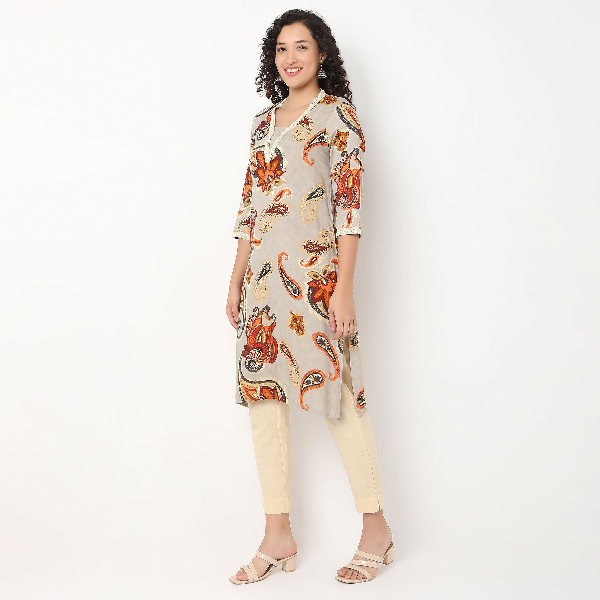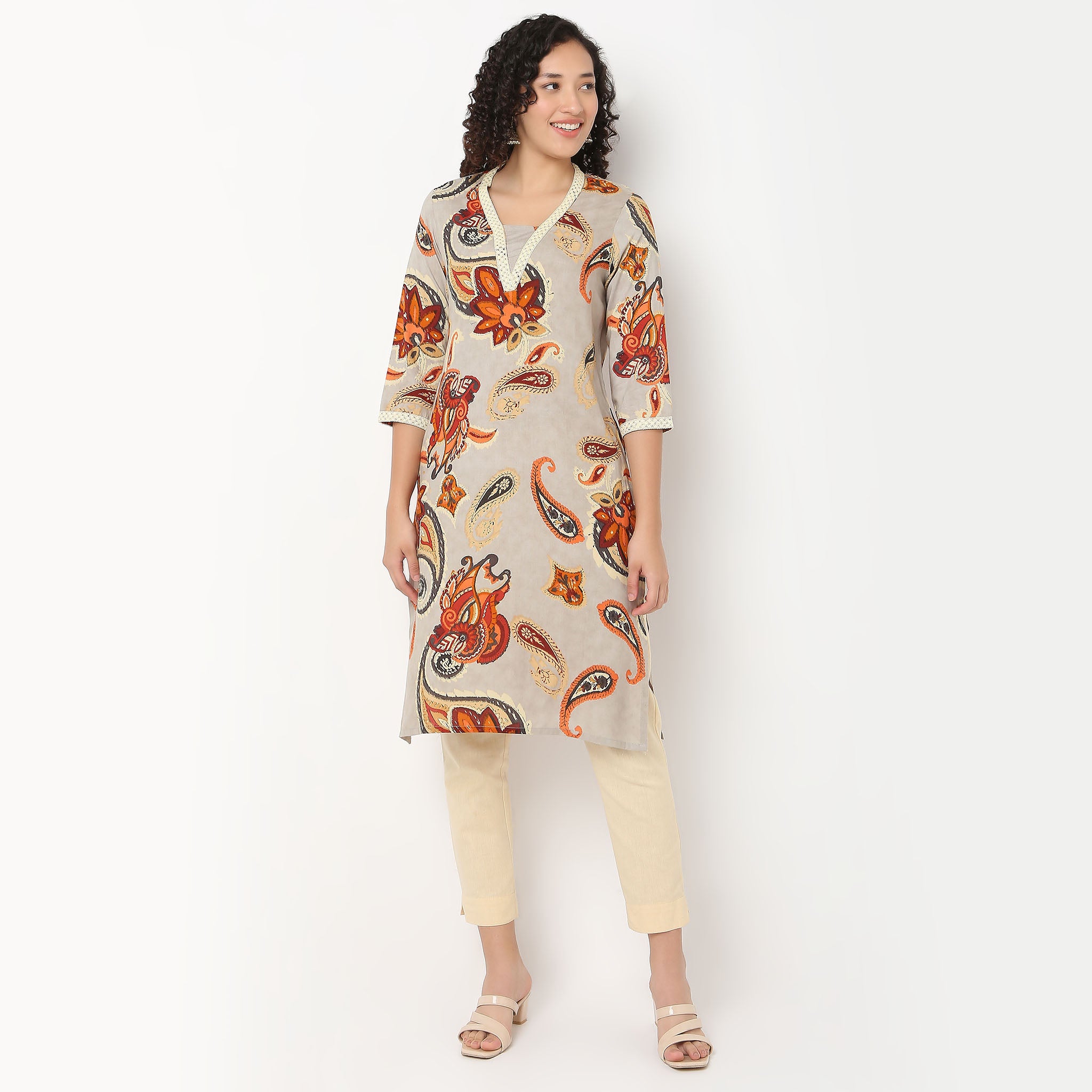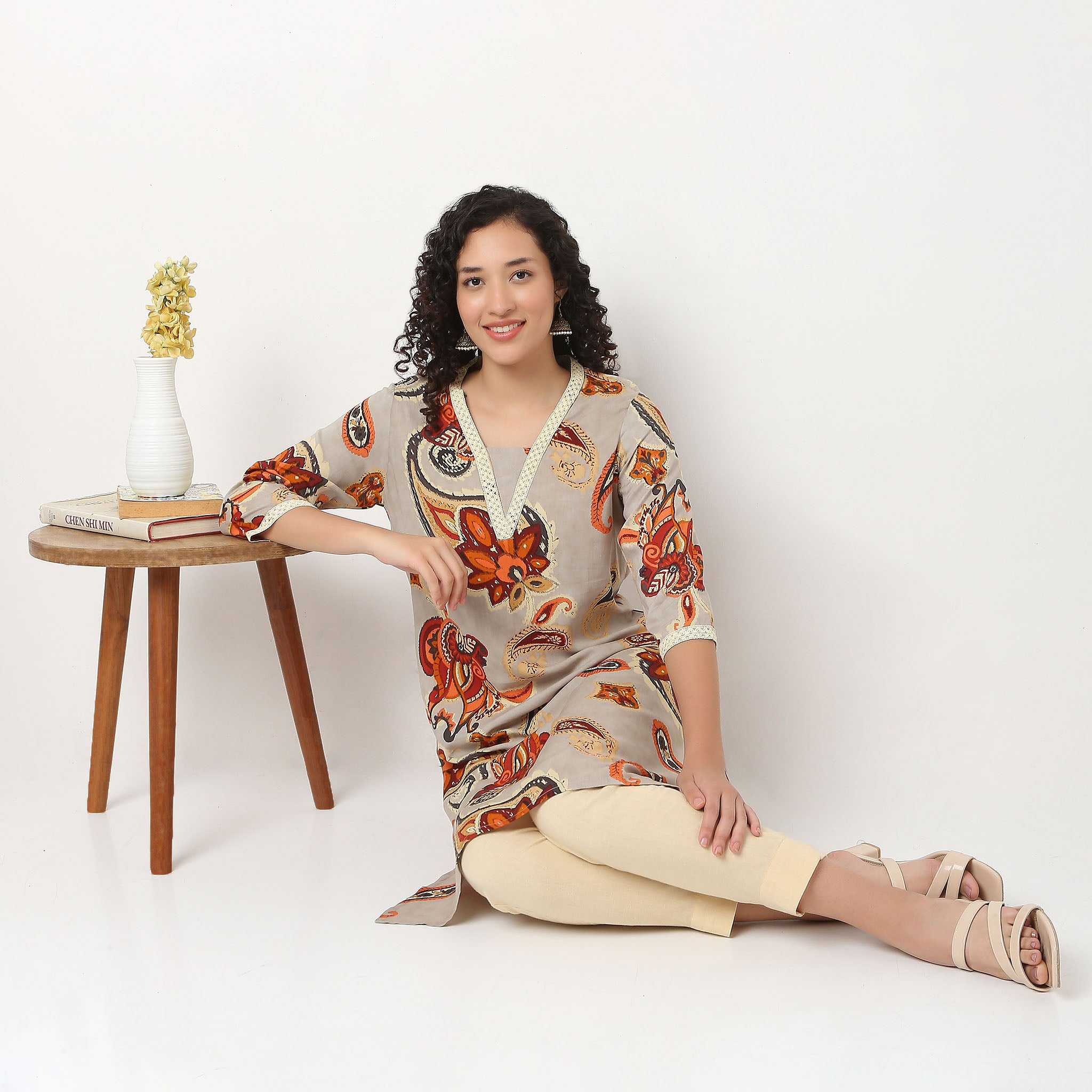 Experience the perfect blend of comfort and style with our V-Neck Long Kurta. Crafted from 100% Rayon, this kurta offers a soft and breathable feel, making it ideal for all-day wear. The elegant printed pattern and calf-length design add a touch of sophistication, perfect for both casual outings and formal gatherings.