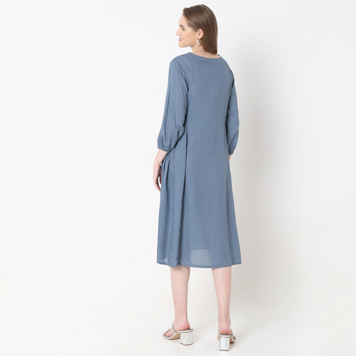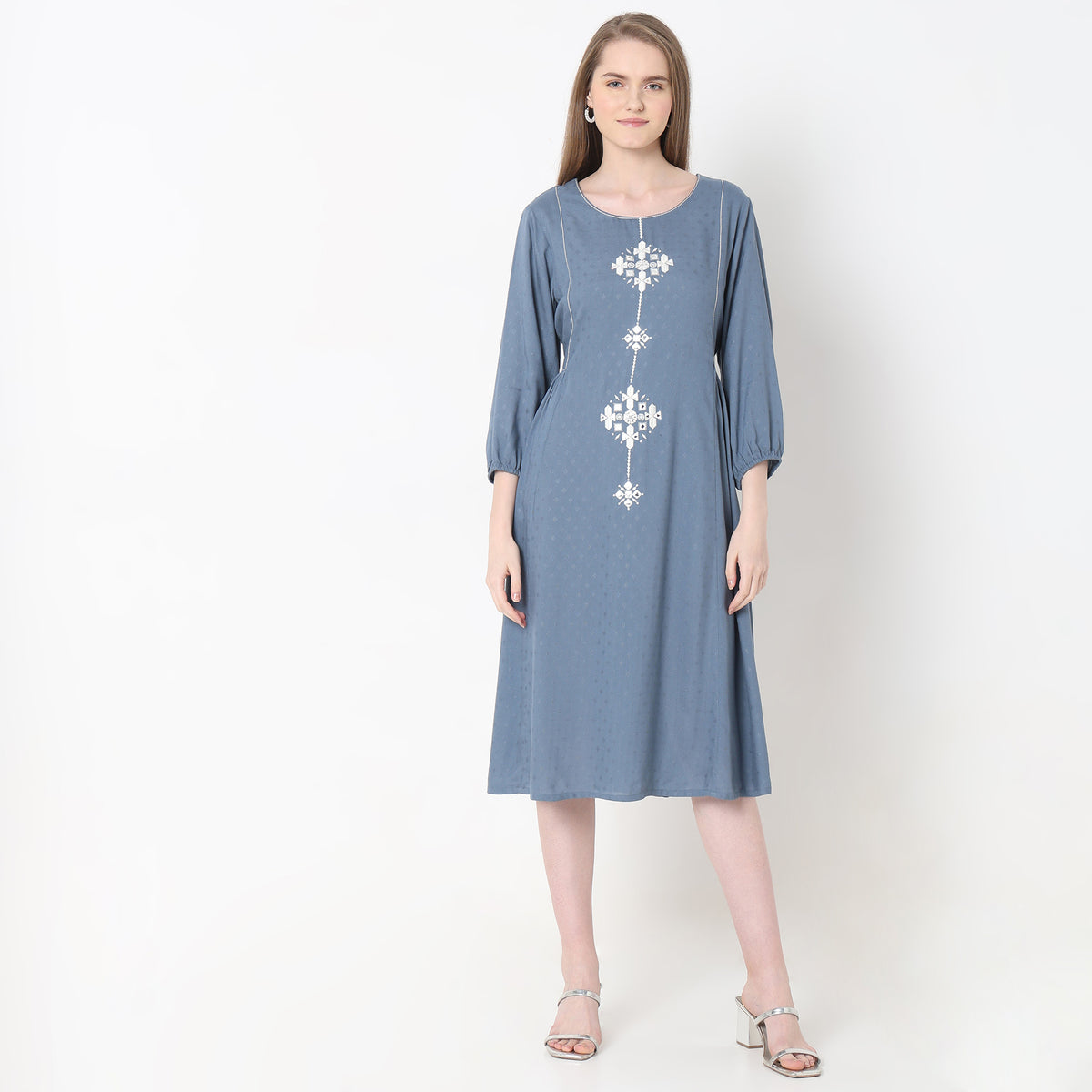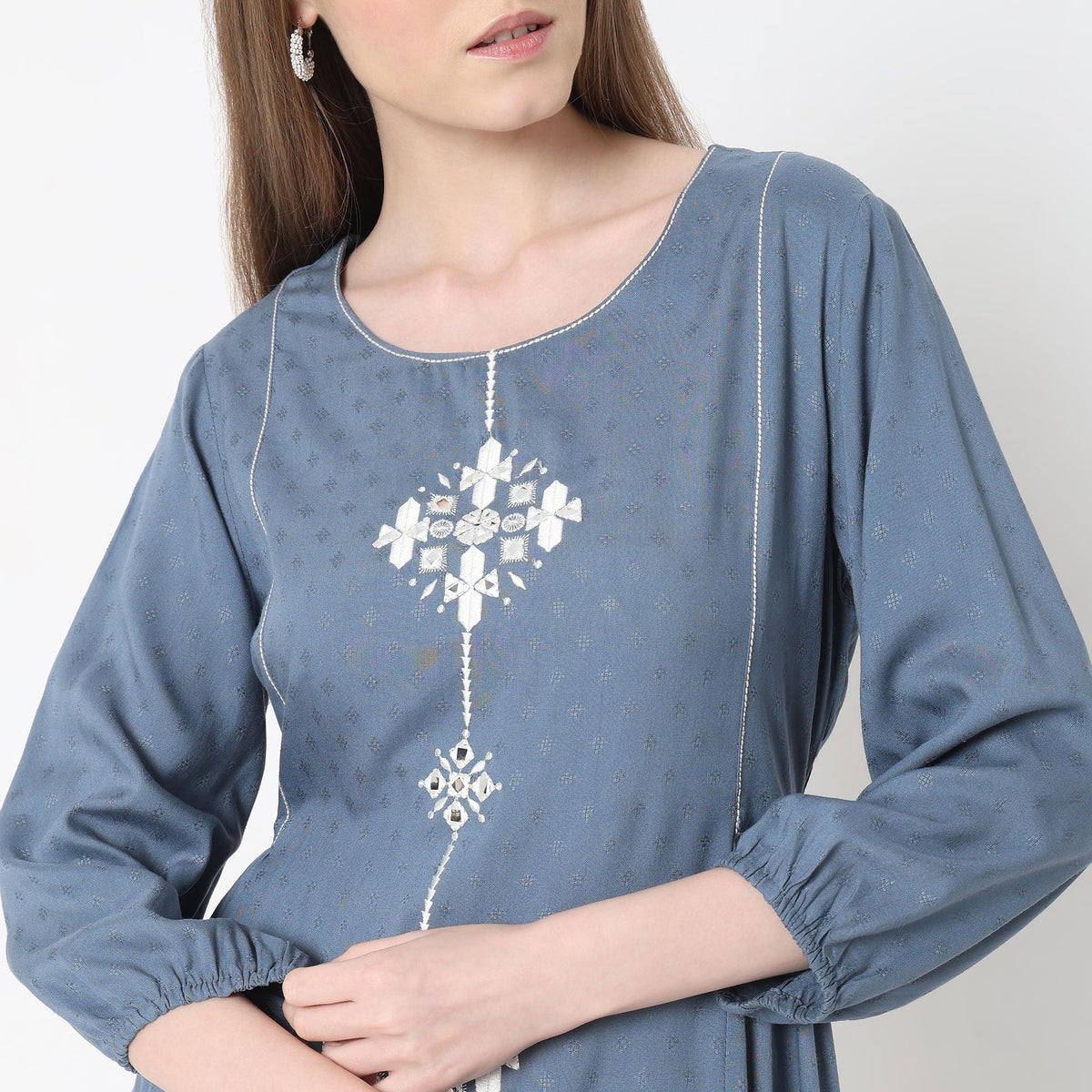 This embellished pattern Dress has a u neck and three-fourth sleeve. Made from viscose, it is soft and comfortable to wear.