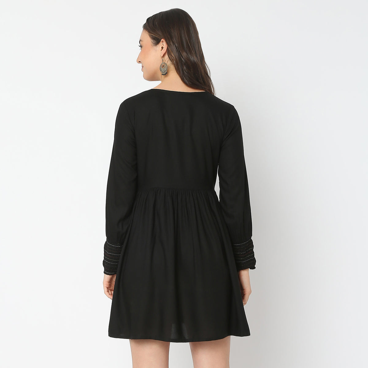 This embroidered pattern dress has a v neck and full sleeve. Made from rayon, it is soft and comfortable to wear.