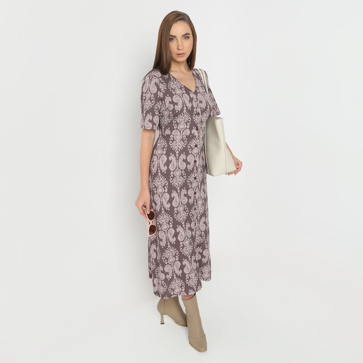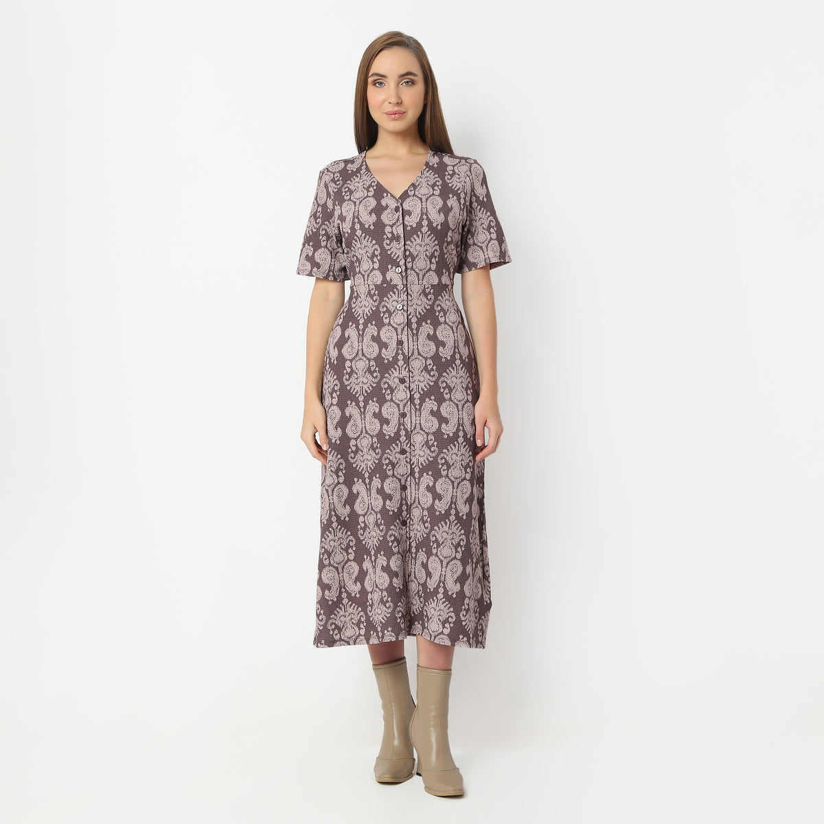 Printed Calf Length V-Neck Short Sleeve Dress