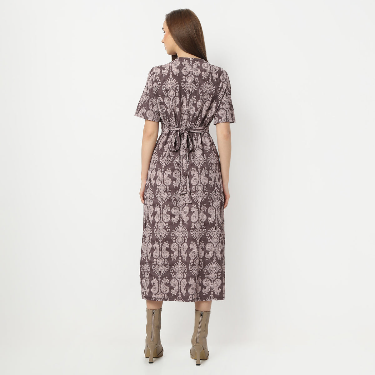 Step into effortless elegance with this Printed Calf Length V-Neck Short Sleeve Dress. Crafted from a blend of polyester and spandex, it offers a perfect balance of comfort and stretch, ensuring you feel as good as you look. The woven fabric and printed pattern add a touch of sophistication, making it a versatile choice for any occasion.