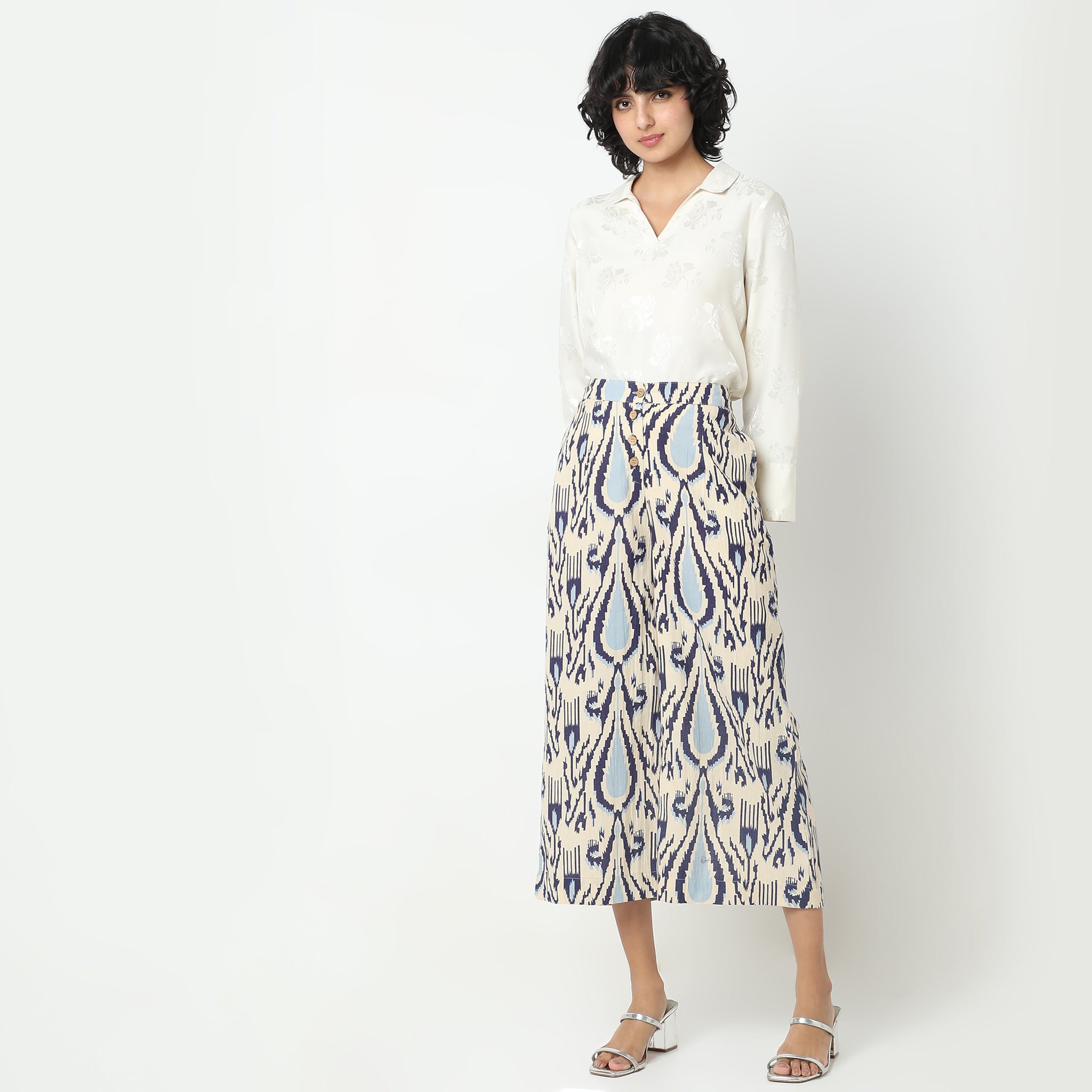 These printed pattern flare fit culottes has ankle length, mid rise waist. Made from viscose cotton flex, it is soft and comfortable to wear.