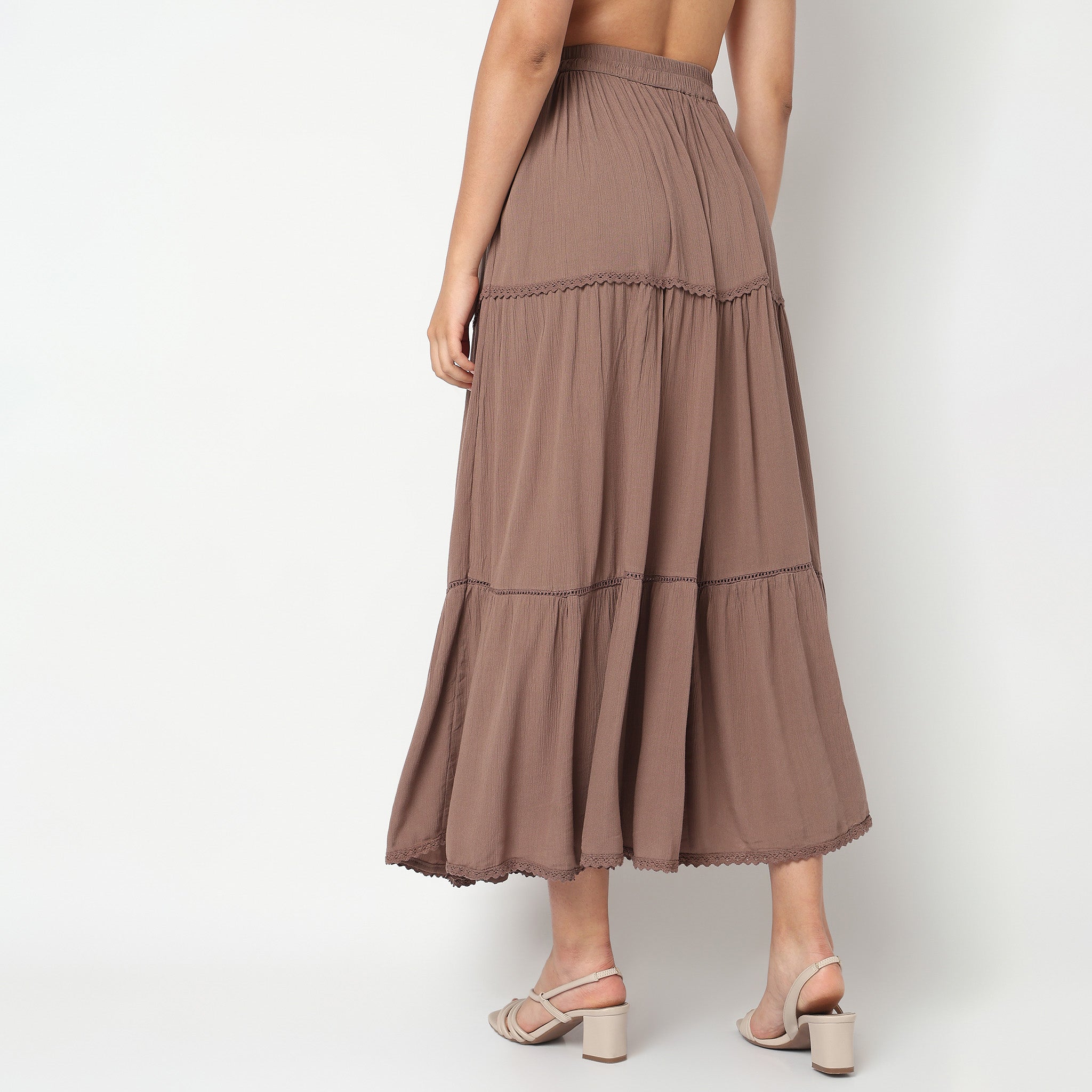 Elevate your wardrobe with our Tiered High Rise Coord Skirt, designed for the modern woman. This full-length skirt features a stylish flare fit, offering both comfort and elegance for any occasion.