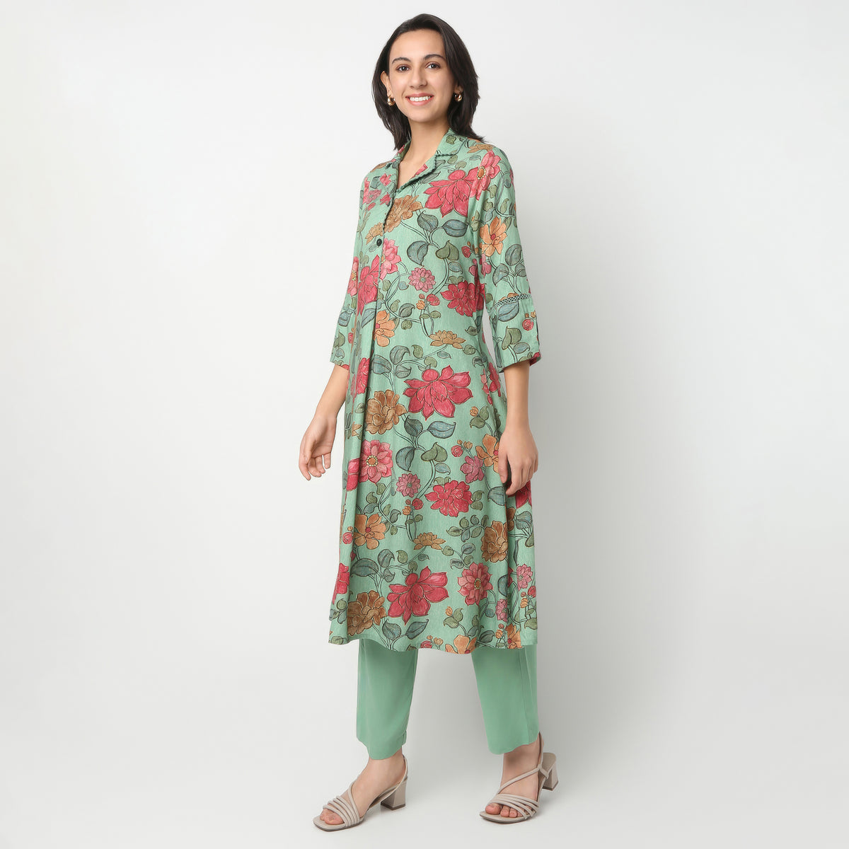 Elevate your ethnic wardrobe with the Printed Below Knee Camp Collar A-Line Flared Kurta with Pant Set. Crafted from 100% rayon, this kurta set is soft, breathable, and perfect for all-day wear. The A-line flared silhouette, camp collar, and Cultural Kalamkari print add a touch of elegance, making it an ideal choice for festive gatherings, casual outings, or workwear.
