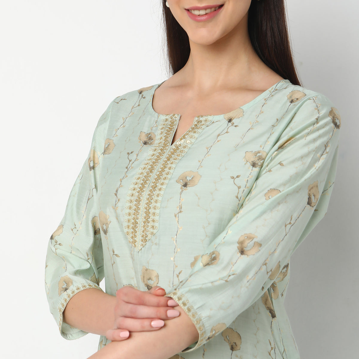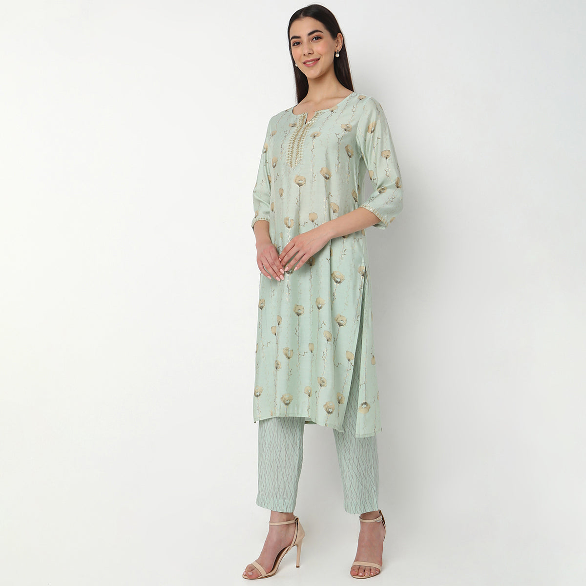 This kurta set has a round neck,three-fourth sleeve and printed detail. Made from viscose polyester, it is soft and comfortable to wear.