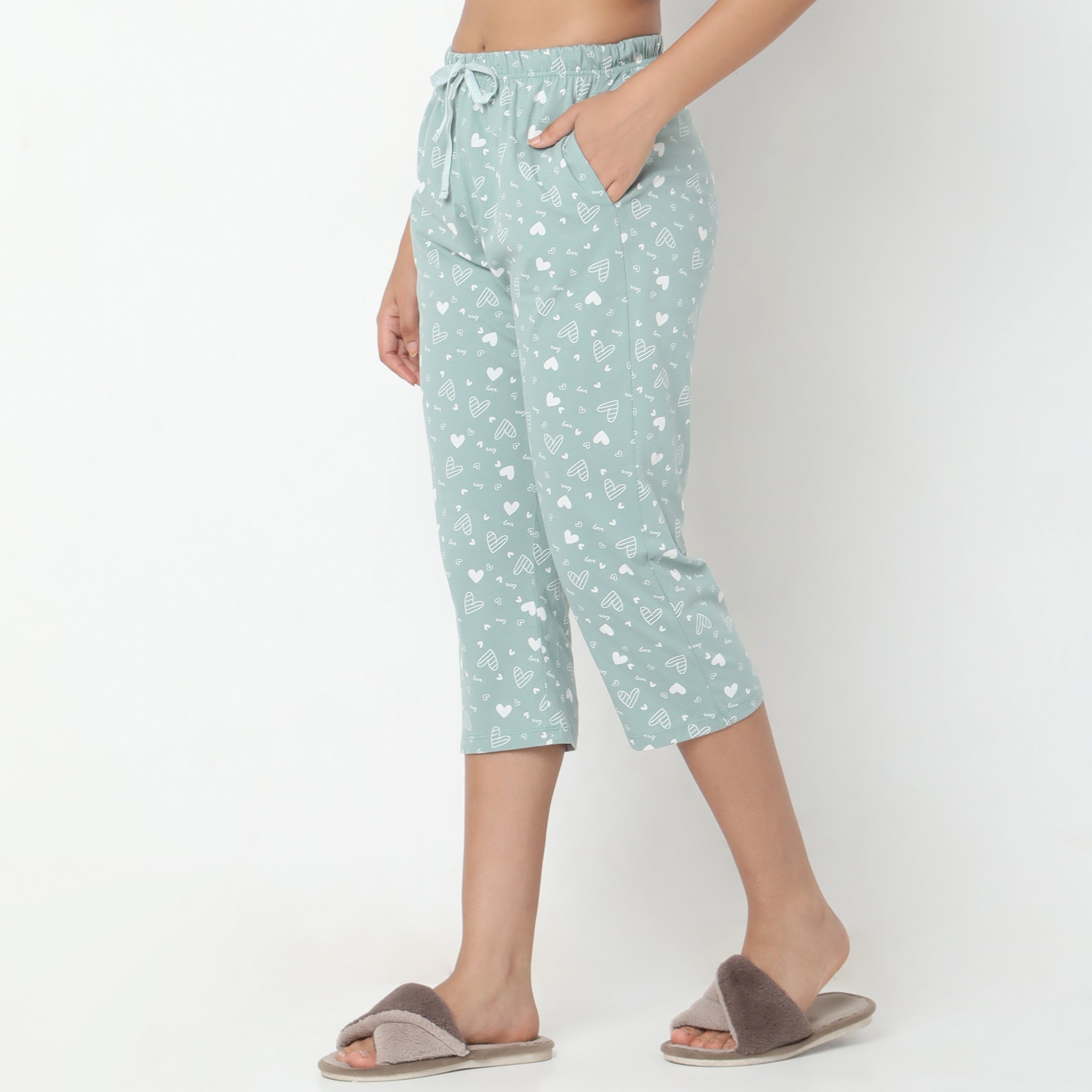 These heart theme printed pattern regular fit capris has regular length, mid rise waist. Made from cotton, it is soft and comfortable to wear.