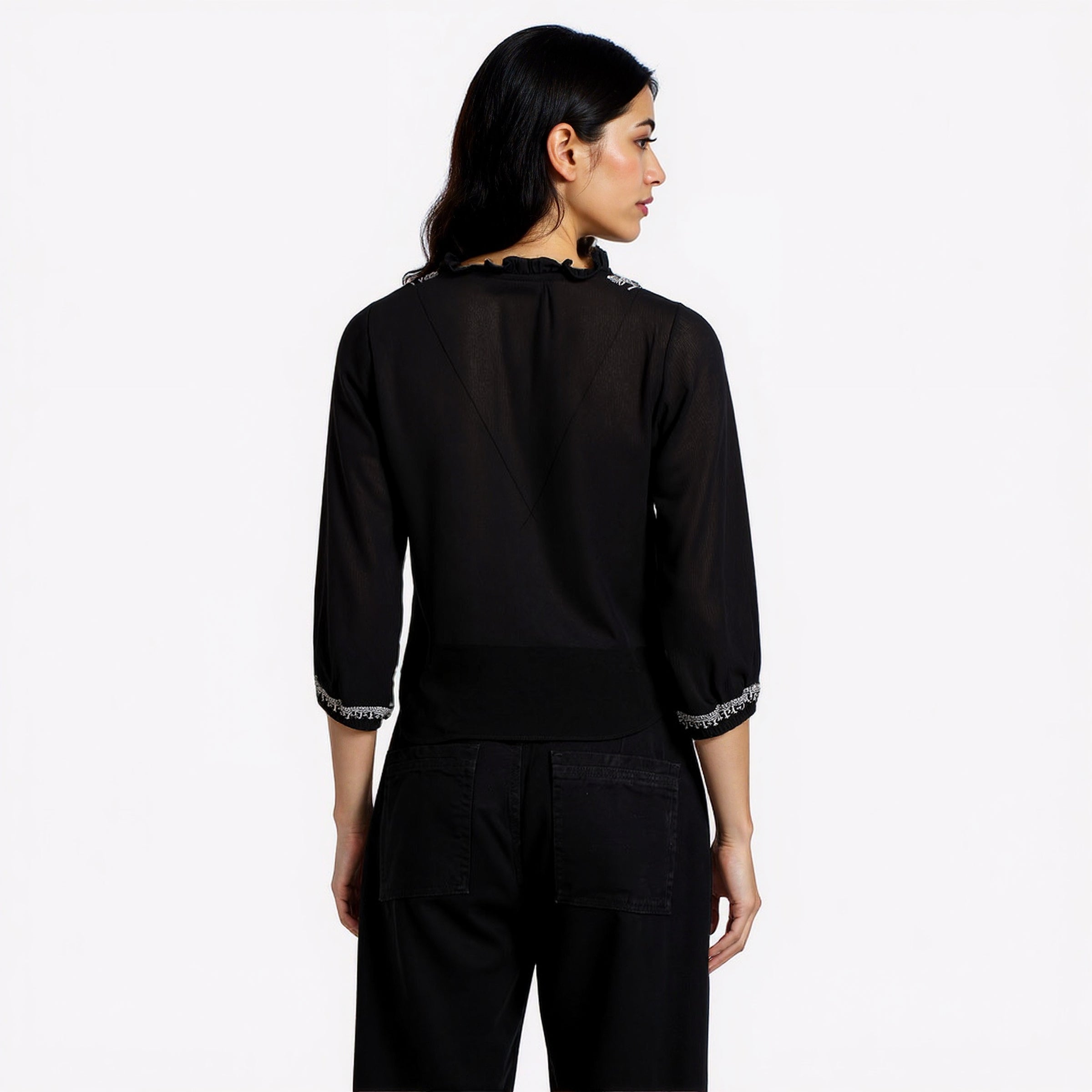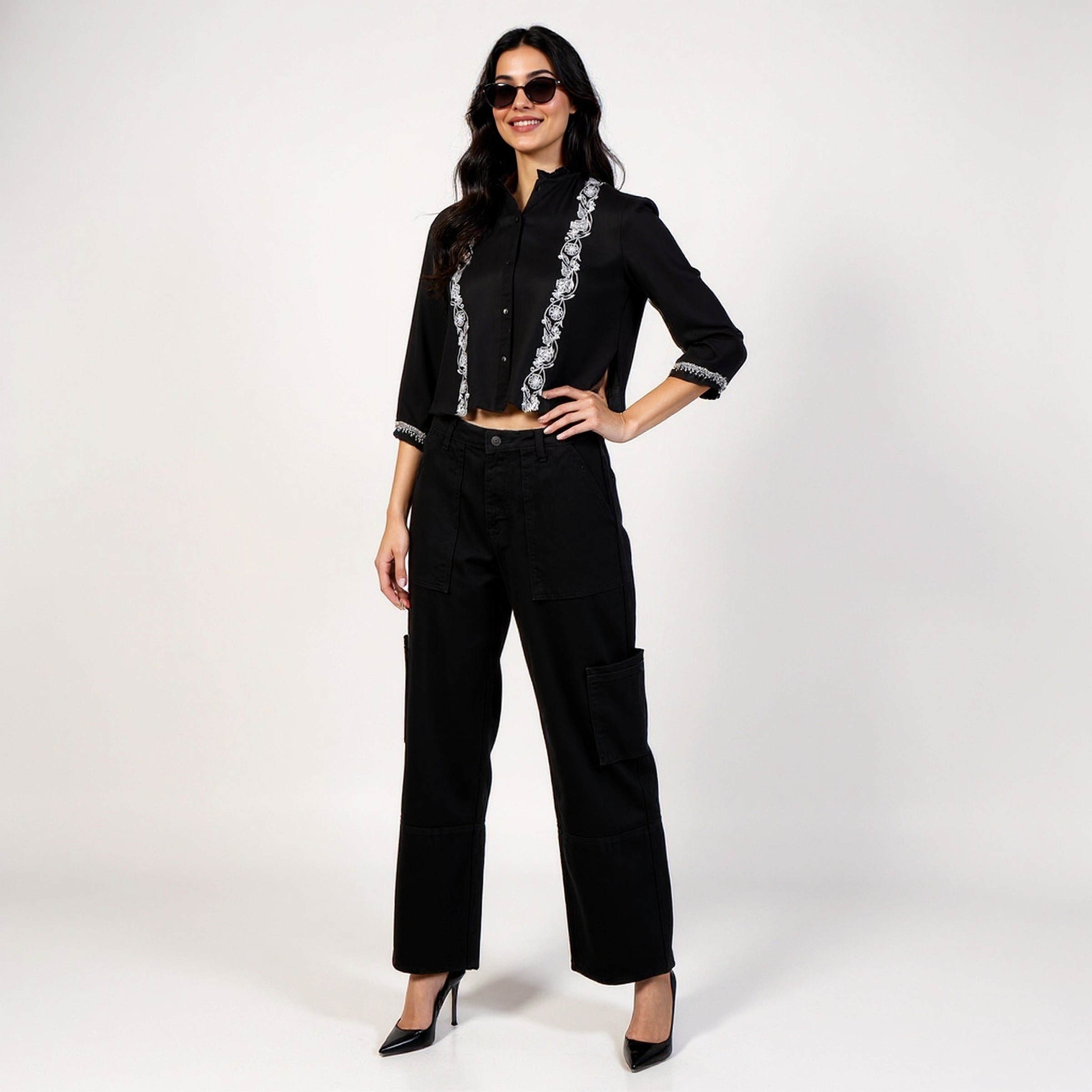 Experience the perfect blend of elegance and comfort with our Embroidered Crop Shirt. Crafted from 100% viscose, this shirt offers a soft and breathable feel, ensuring you stay comfortable all day long. The intricate embroidery adds a touch of sophistication, making it a versatile piece for any occasion.