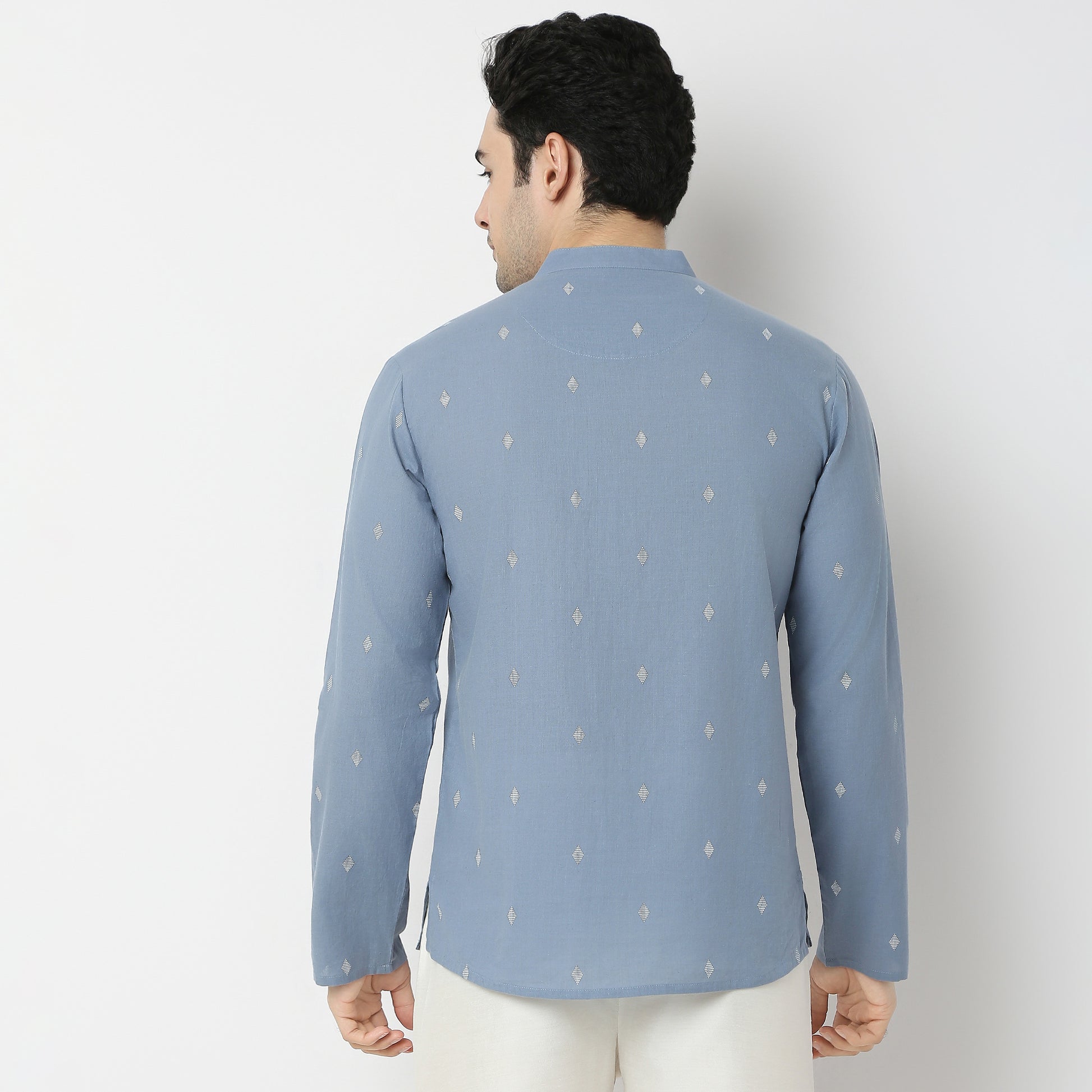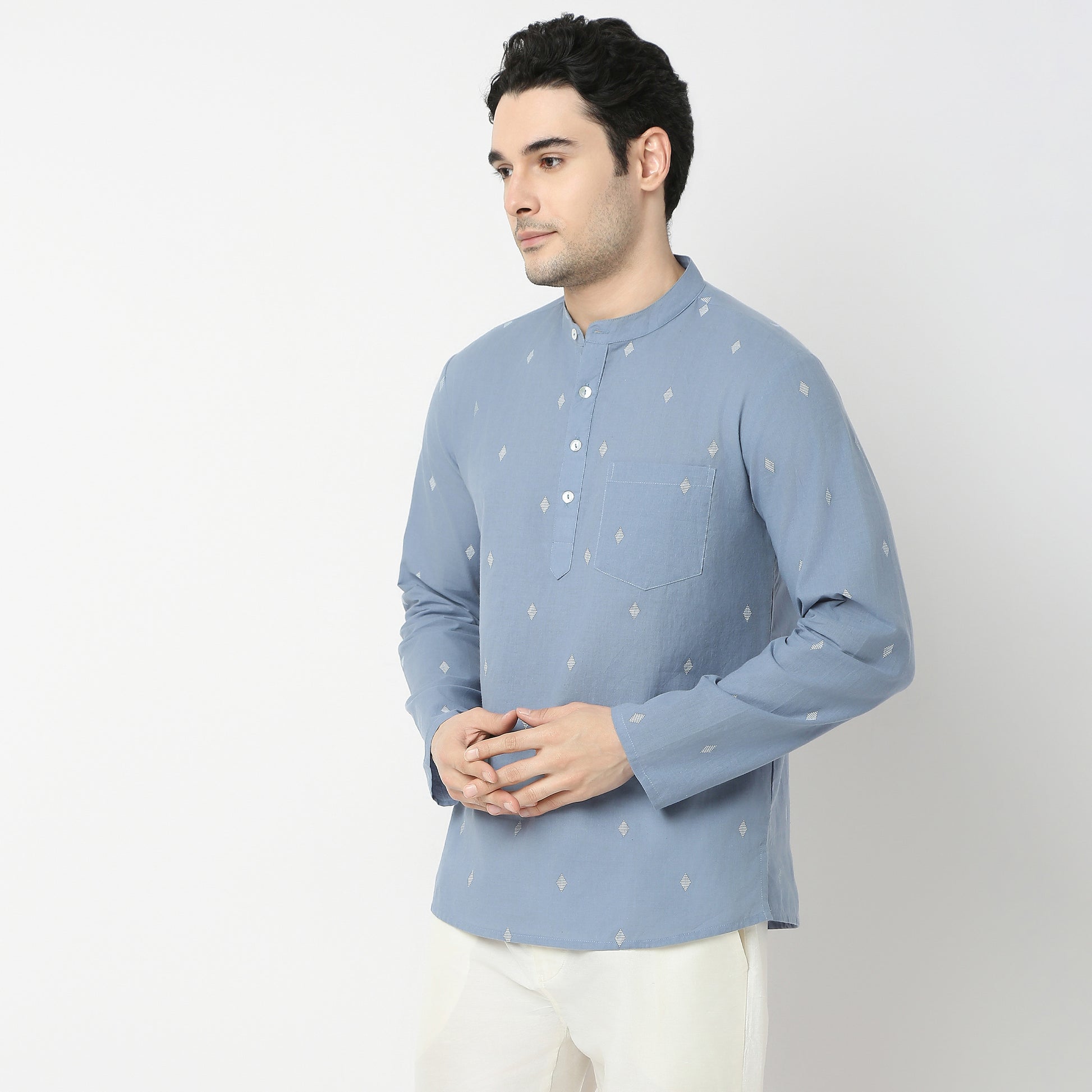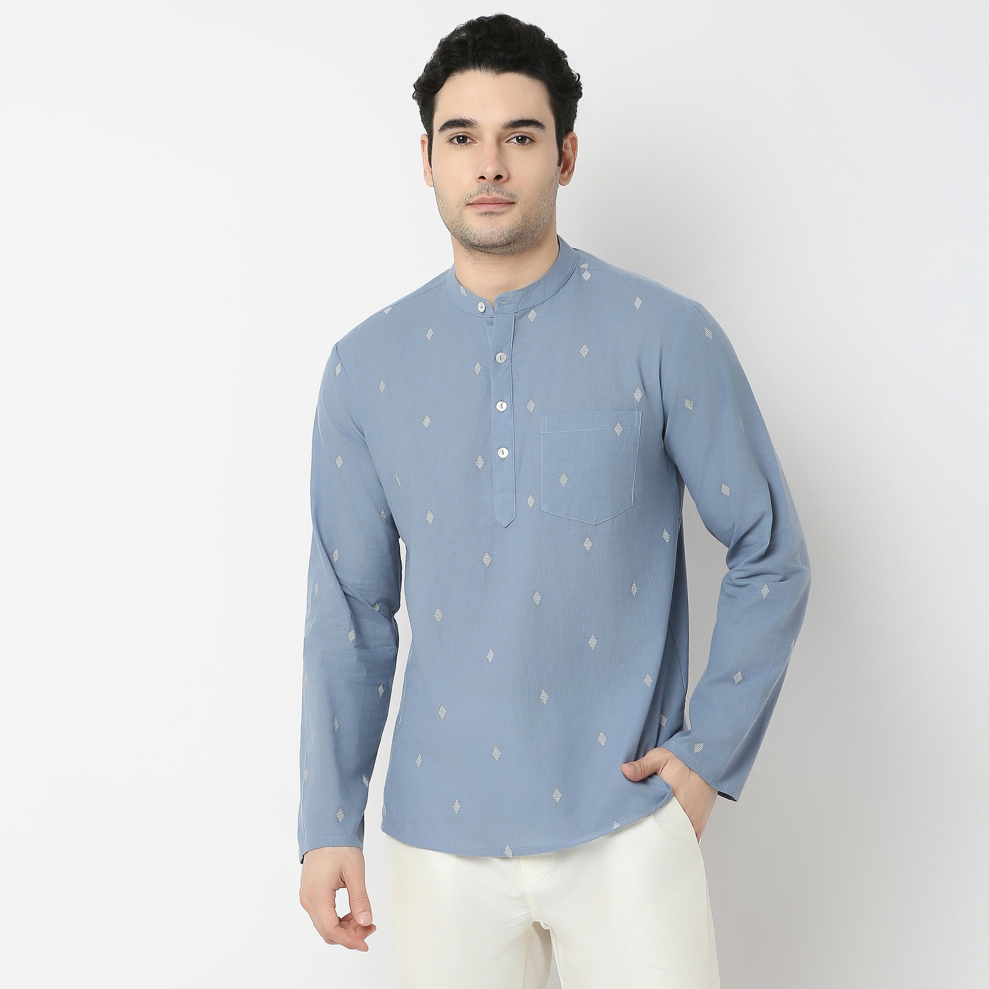 This jacquard pattern kurta has a mandarin collar and full sleeve. Made from cotton, it is soft and comfortable to wear.